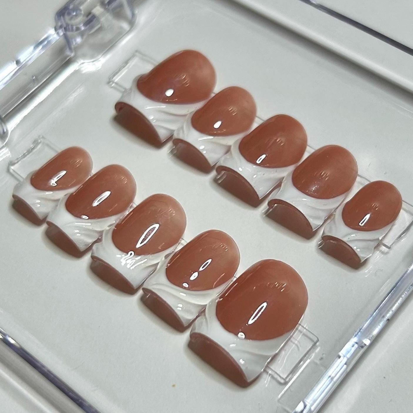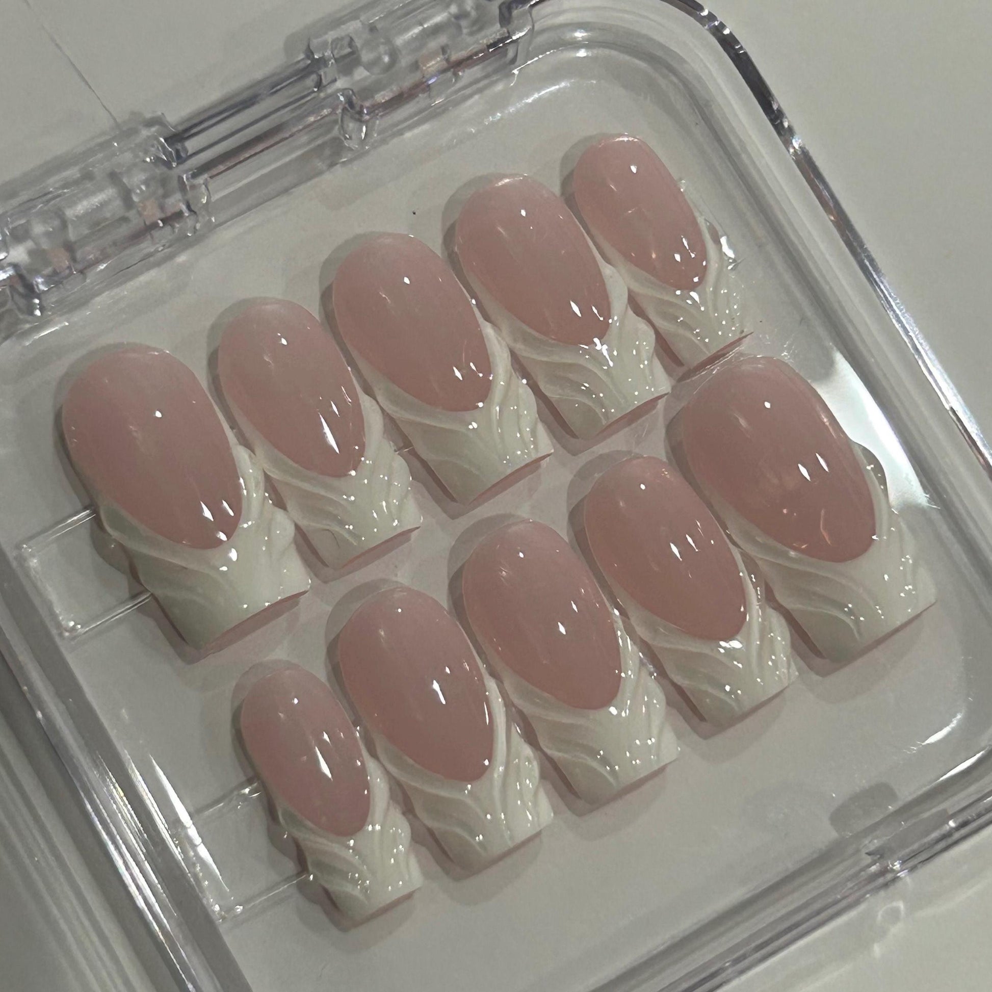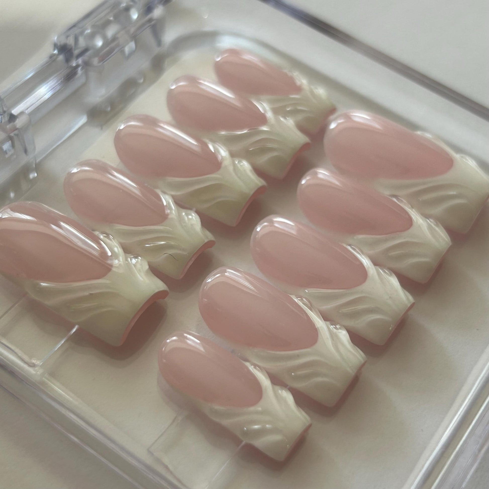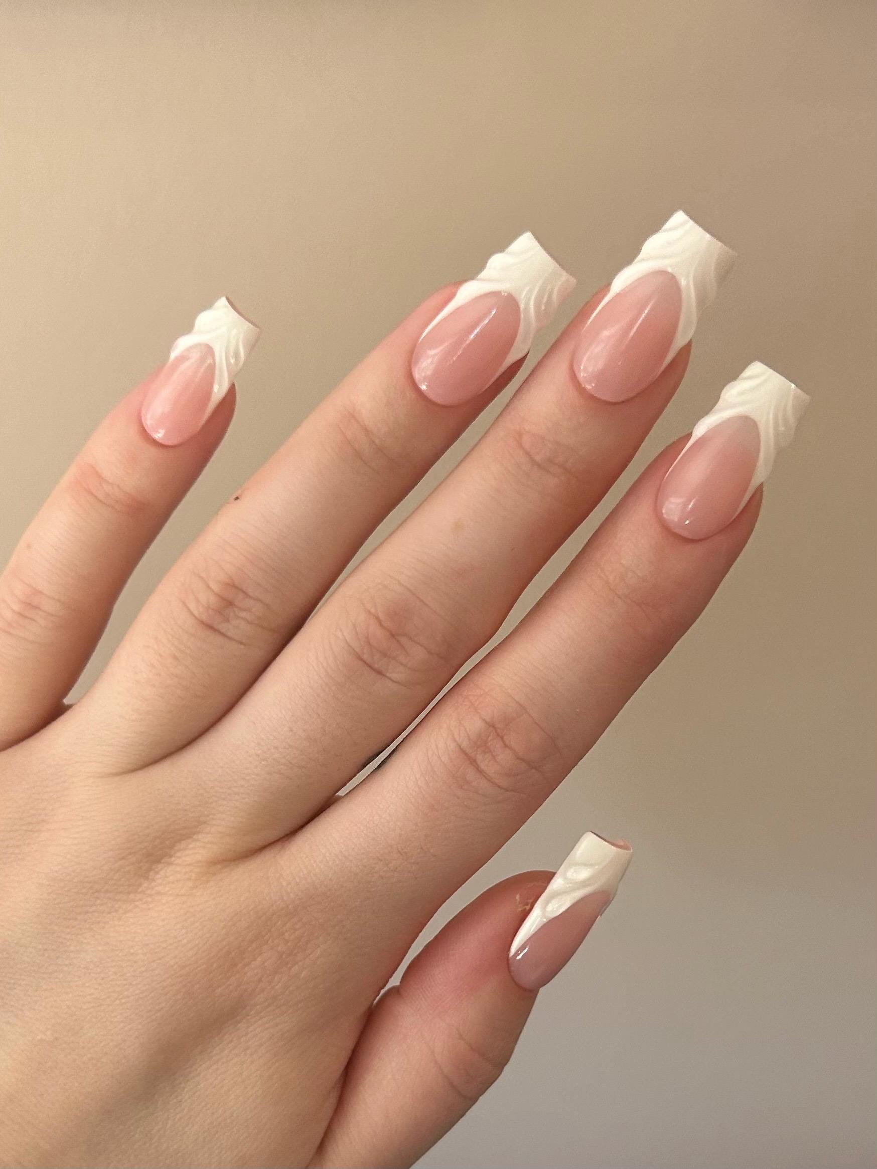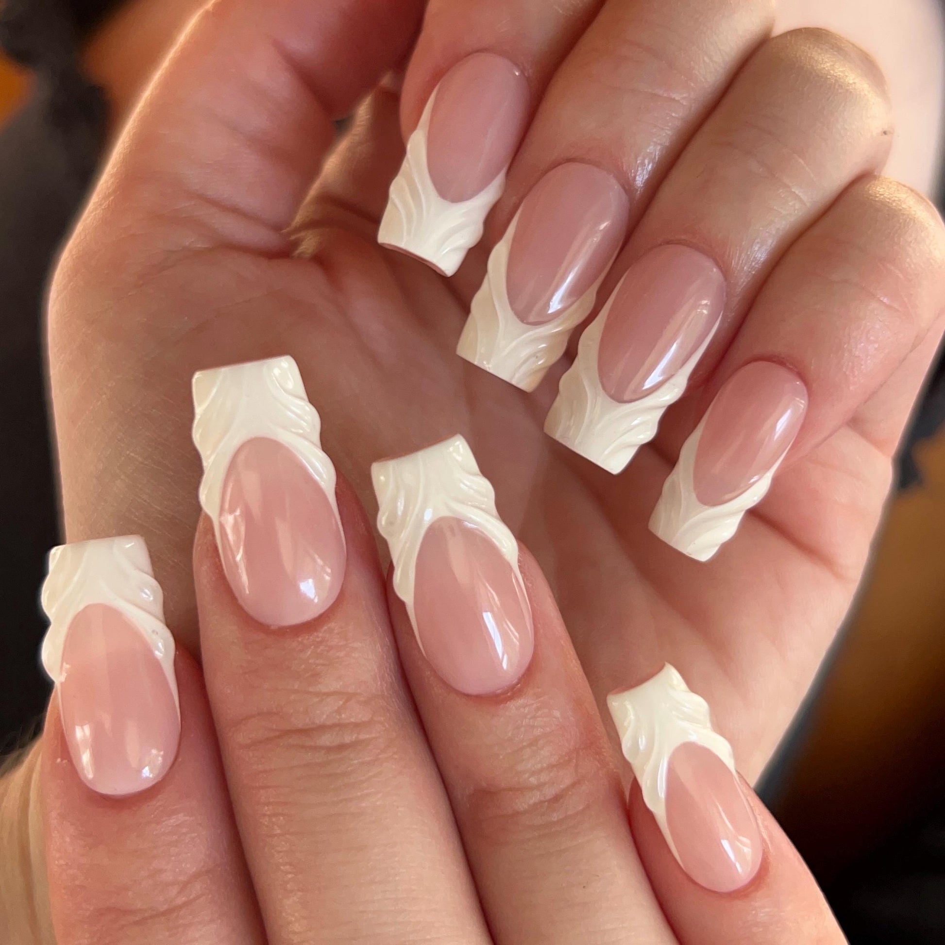 A set of 10 Apres Gel X French manicure nails featuring an apex structured builder gel for an acrylic look, and glossy 3d swirls. Base and tip colors are customizable.