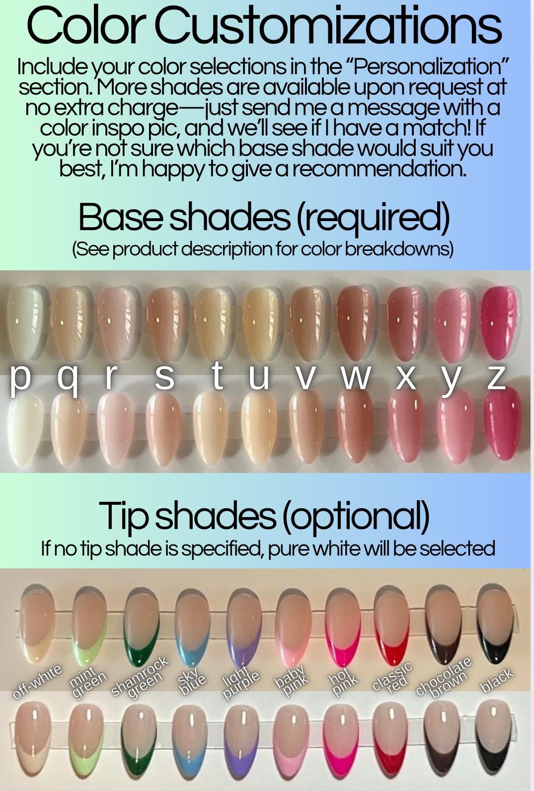 Color breakdowns for Nude and French Tip sets. Please include your selection in the text box above. To try out your color before purchasing a set, check out my Shade Finder Kit!
