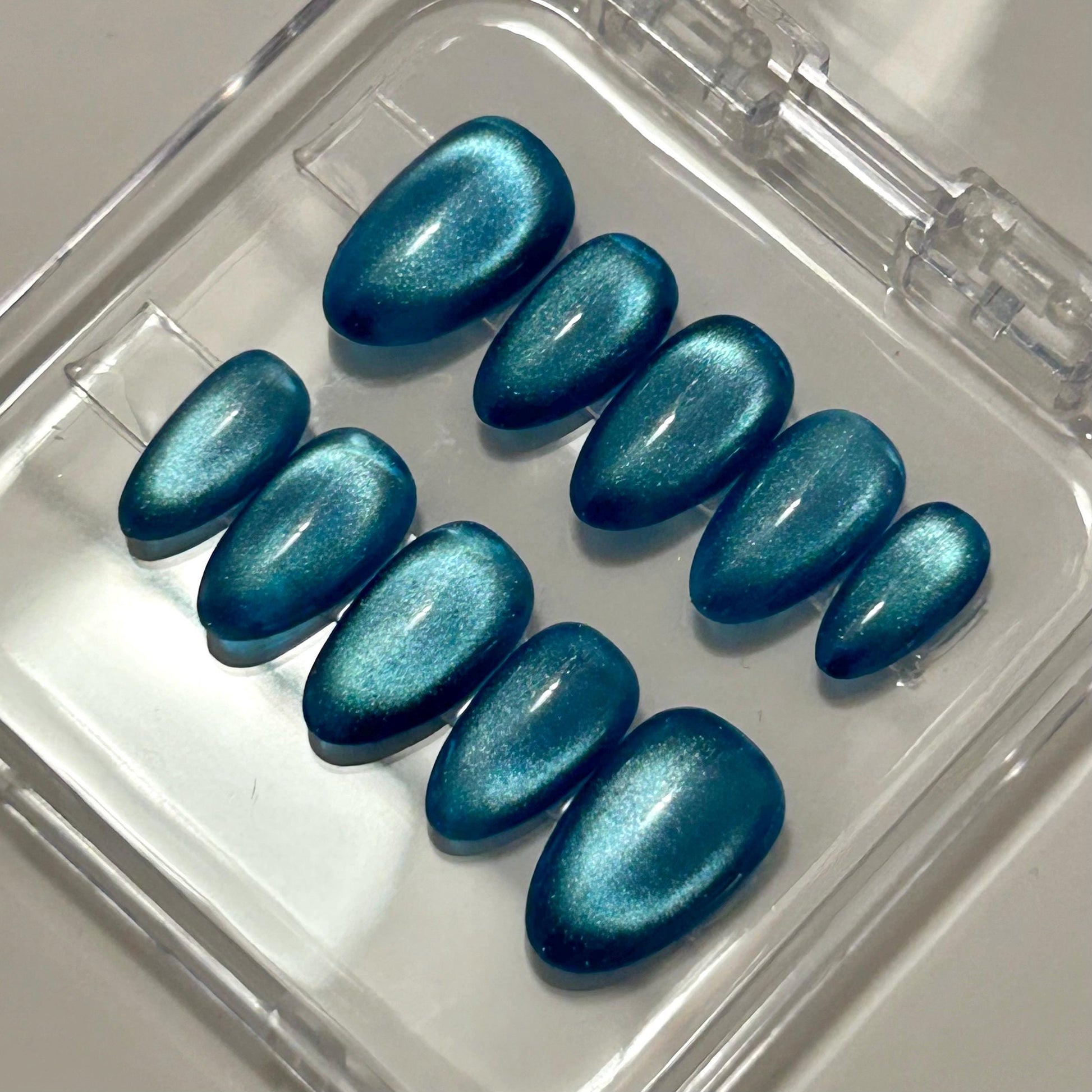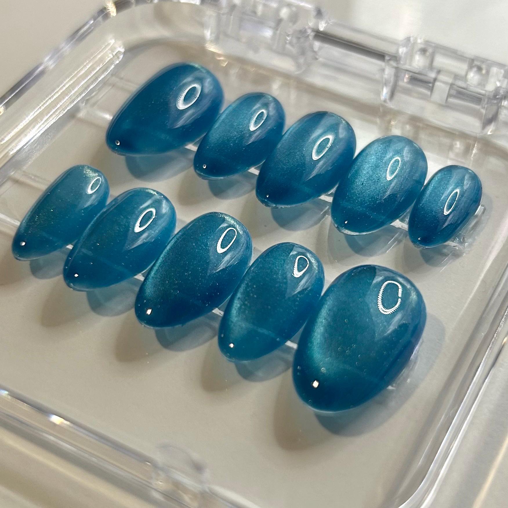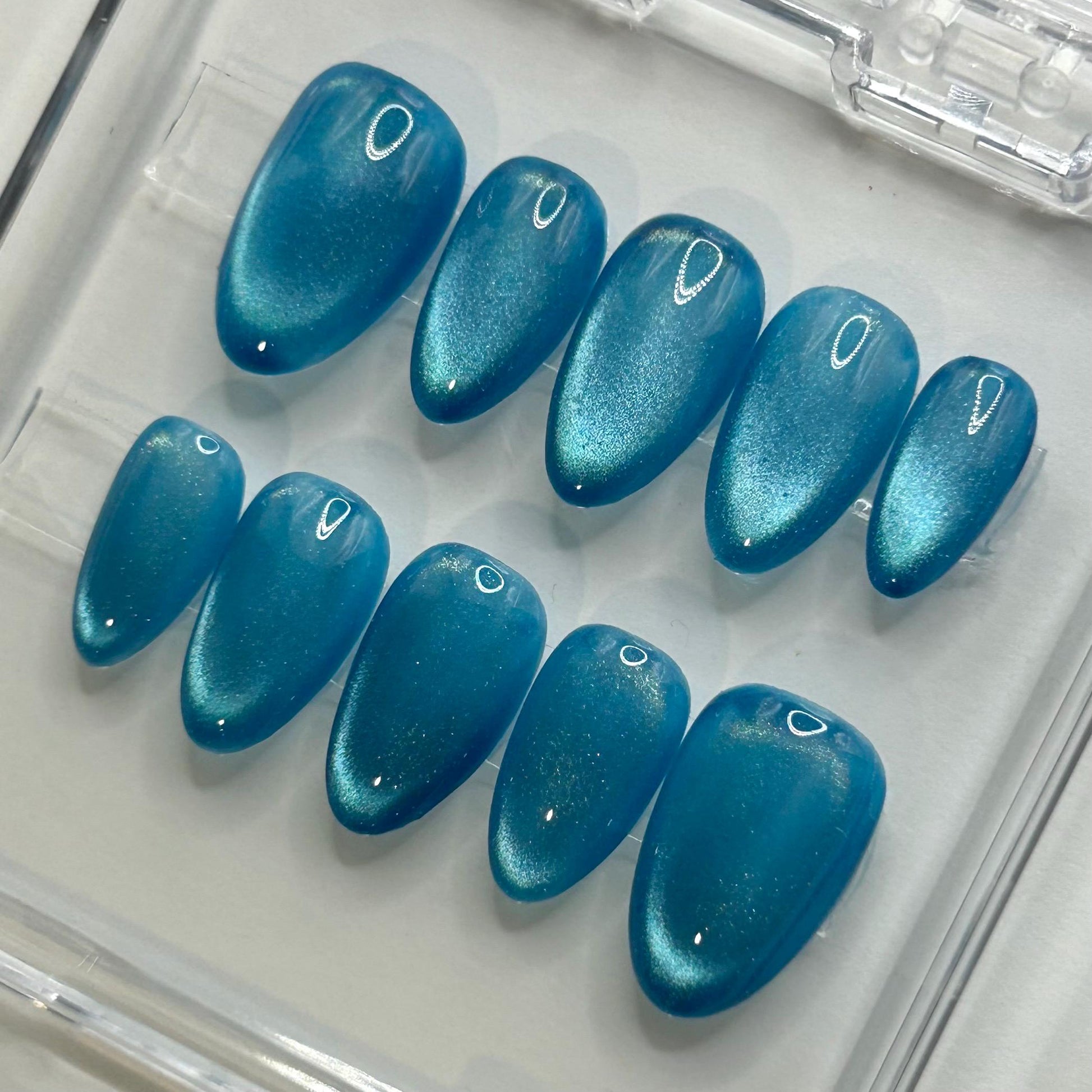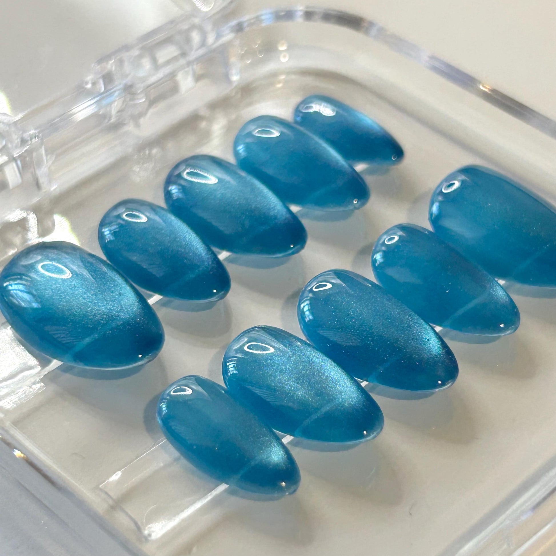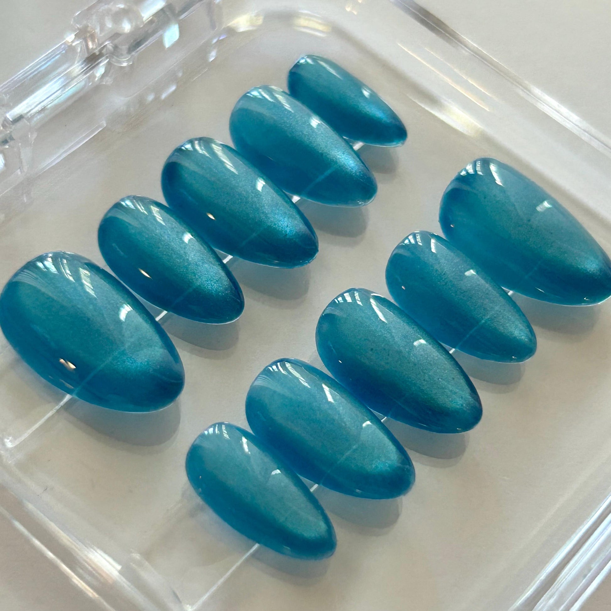 Pictured in Short Almond. Bright ocean blue Apres Gel X press-on nails with a structured builder gel apex and reflective cat eye design that shifts in the light. Please note: colors and shine will vary depending on photography, lighting and angles. Slight irregularities may occur due to the handmade nature of this set.