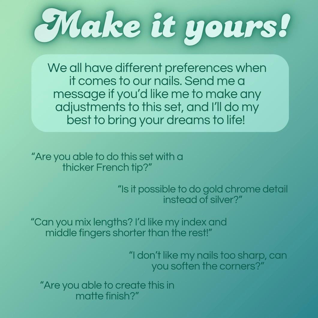 Because each item is handmade to order, I’m unable to offer refunds, returns, or exchanges. I kindly ask that you review all sizing and product details carefully before placing your order. That said, if there’s ever an issue with quality or something isn’t quite right, please don’t hesitate to reach out! I’ll always do my best to correct any mistakes and ensure you’re happy with your nails.