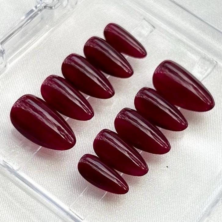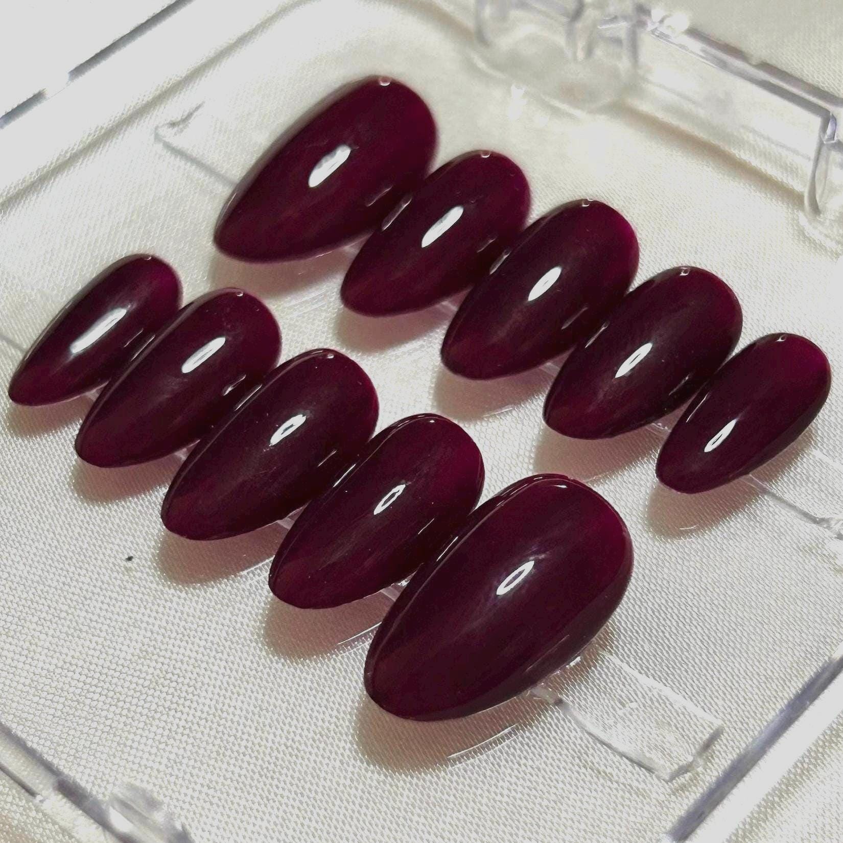 Pictured in Medium Almond (on model) and Short Almond (on packaging). Solid press-on nails featuring DND’s viral Cherry Mocha for a deep, sophisticated blend of dark red plum with nearly black undertones. Please note: colors and shine will vary depending on photography, lighting and angles.