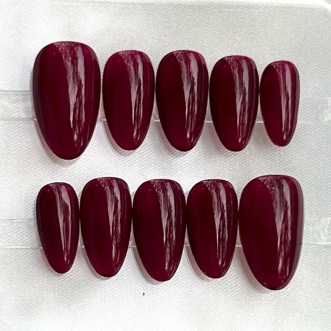 This set is crafted with meticulous care using high-quality materials, including Après Gel-X tips, Après Gel-X Prep surface primer, base gel, DND Cherry Mocha gel color, builder gel for added shine, structure, and reinforcement, and a topcoat to seal everything perfectly. With proper care, these luxury press-ons are reusable and built to last!