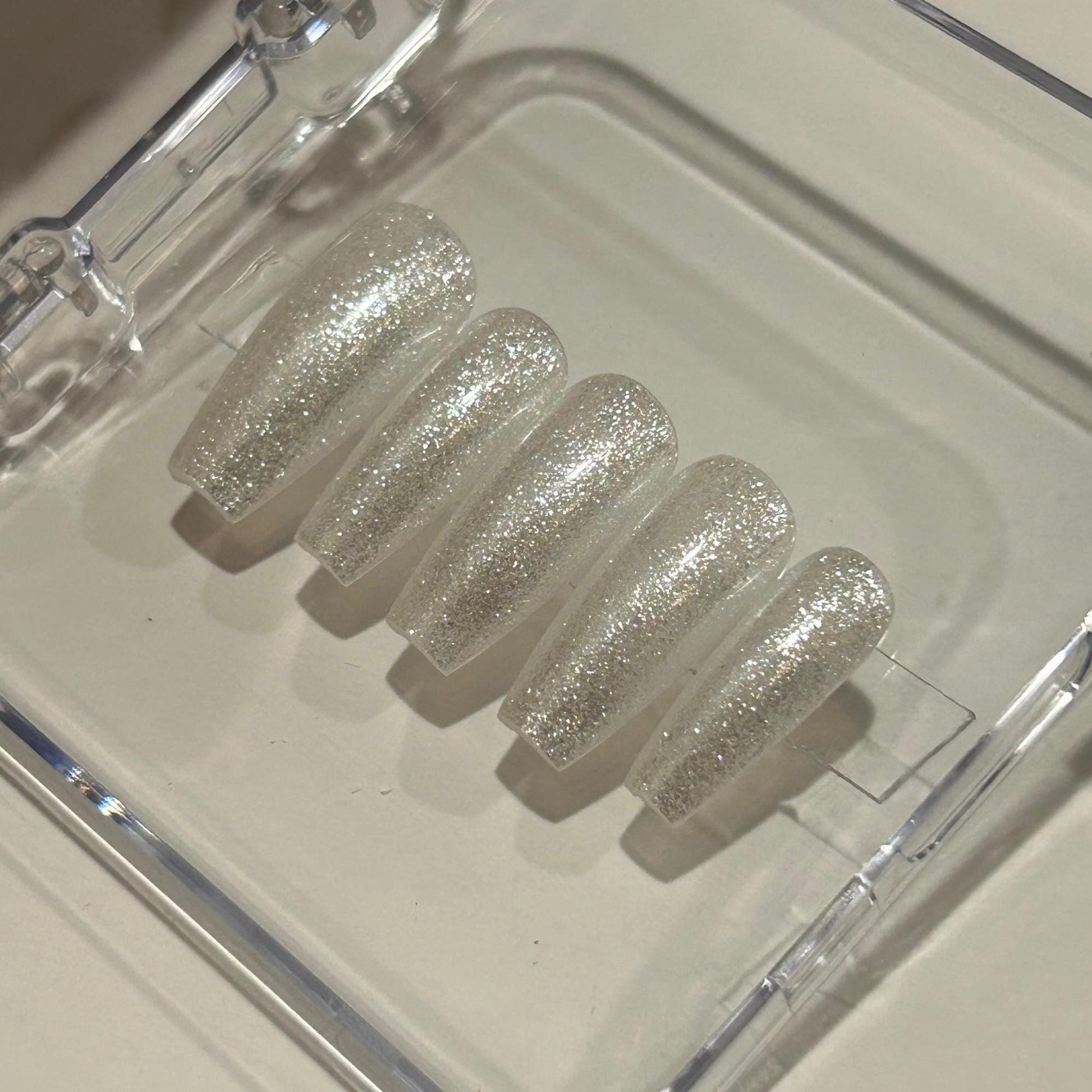 Pictured in Medium Coffin. Soft gel press-on nails featuring DND’s twinkling white glitter Mother Of Pearl gel polish, and topped with a structured layer of builder gel for a salon-fresh look. Please note: colors and shine will vary depending on photography, lighting and angles. Slight irregularities may occur due to the handmade nature of this set.