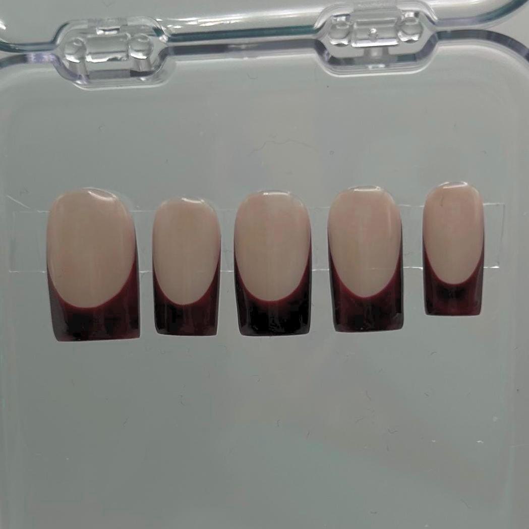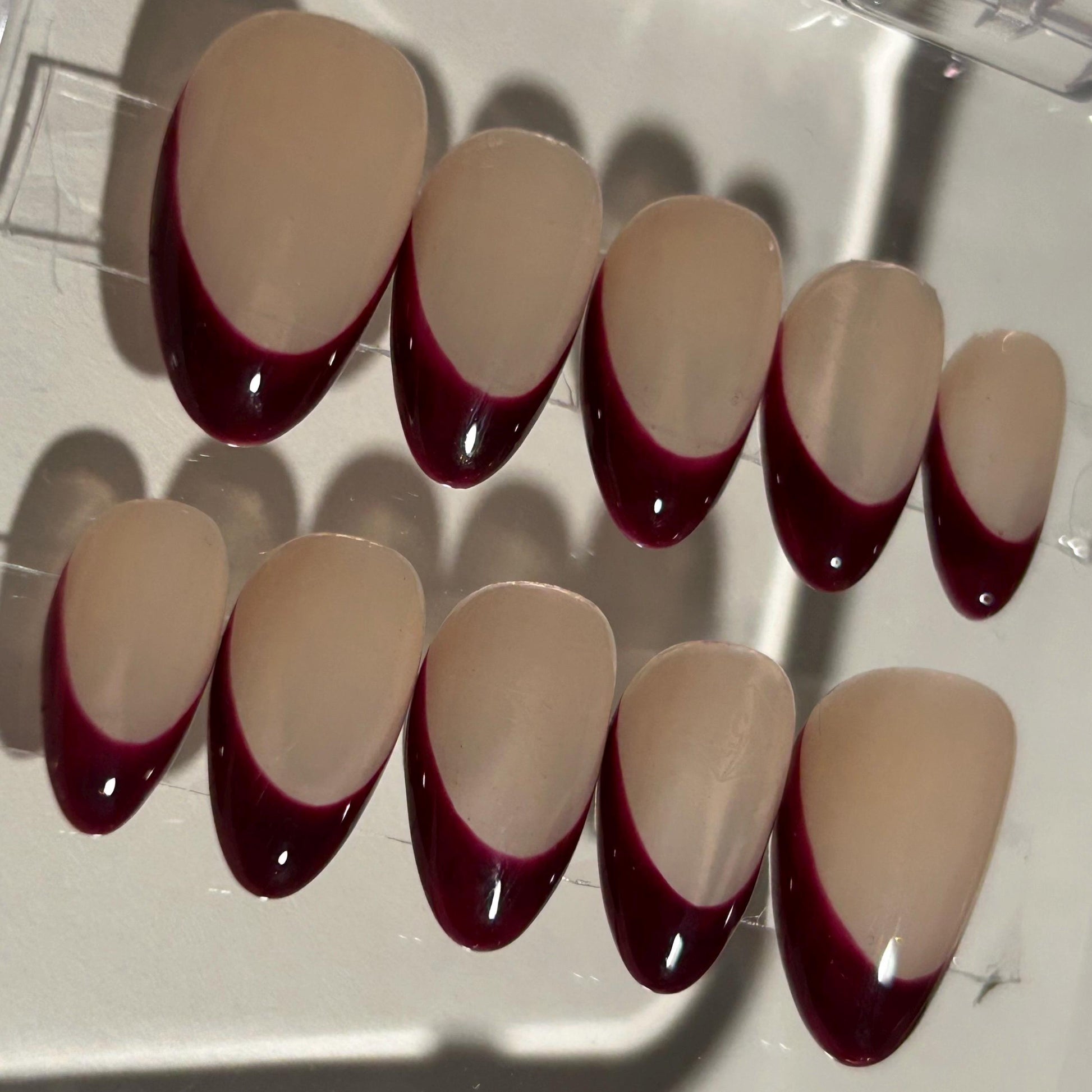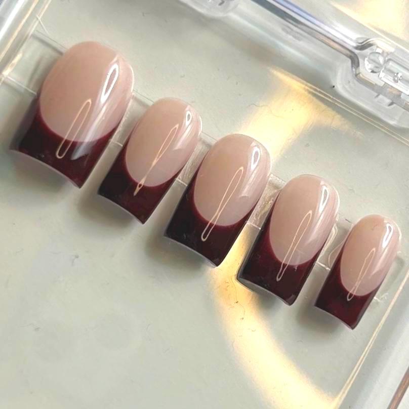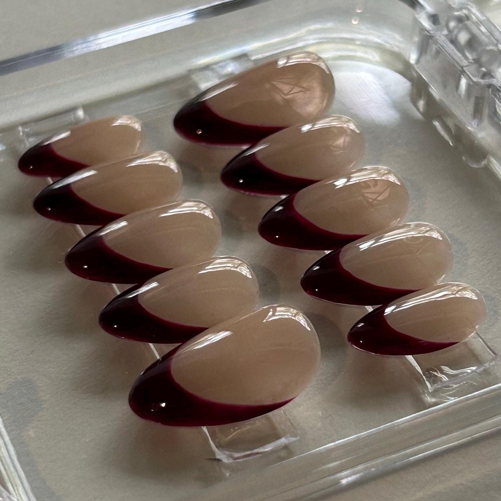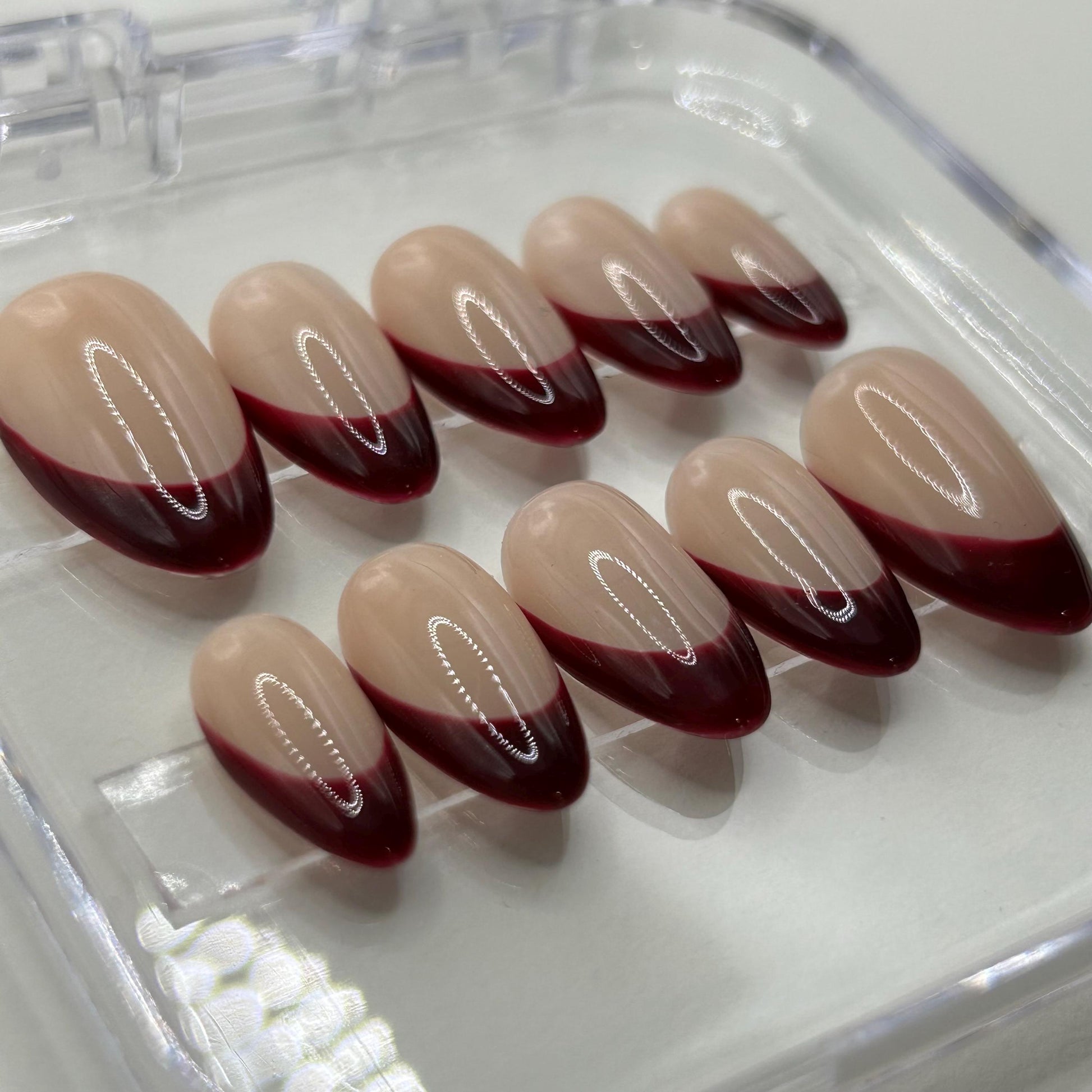 Pictured in Short Almond and Short Square. Elegant press-on nails featuring a deep, dark burgundy red French tip design. The base color is fully customizable to match your style, offering the chic look of acrylics with the convenience of press-ons. Please note: colors and shine will vary depending on photography, lighting and angles. The dark red appears black in some lighting.