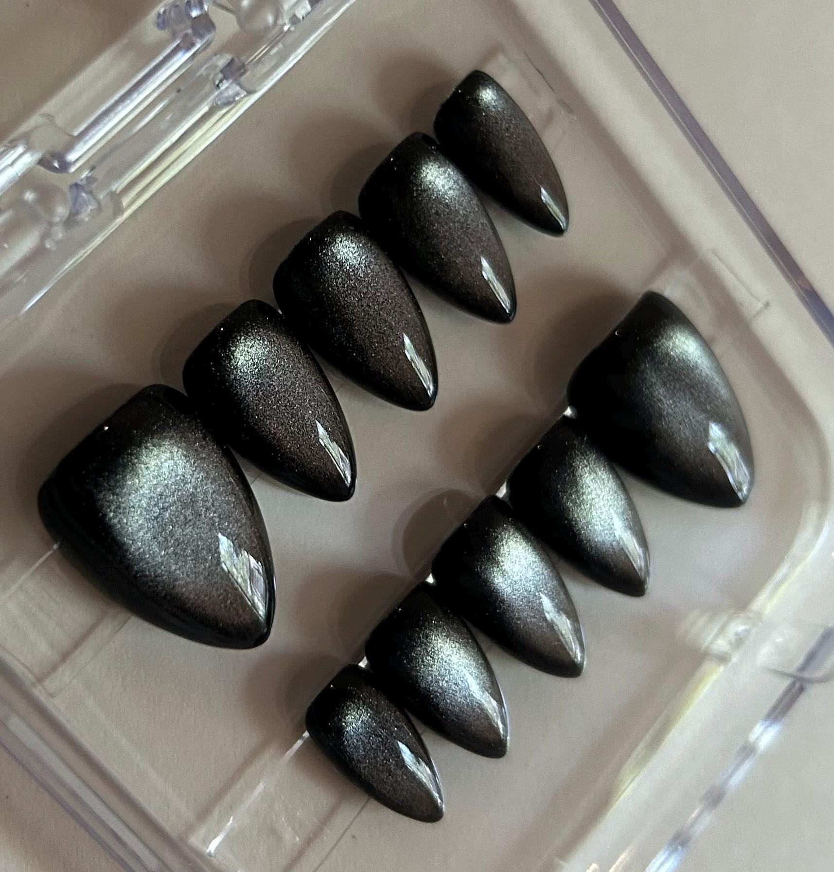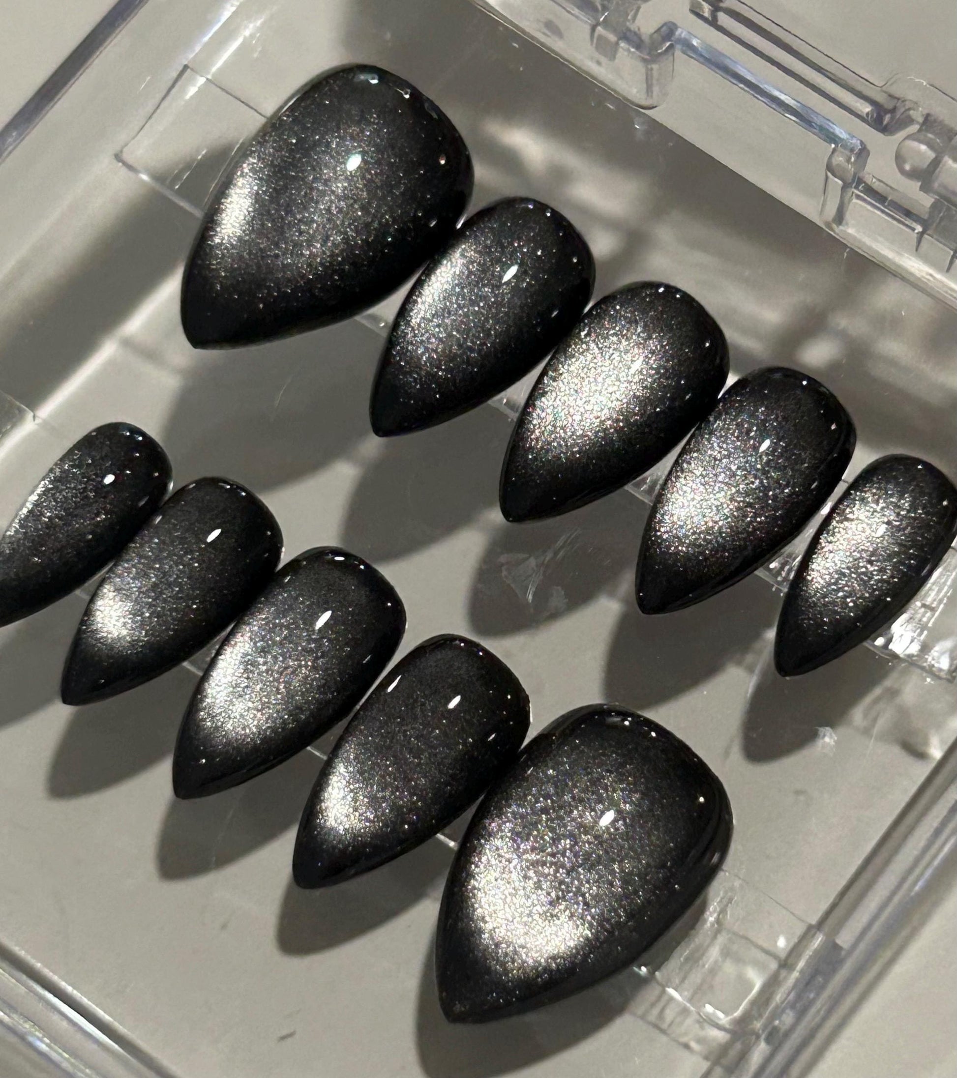 Pictured in extra short stiletto. A sister to my Blood Moon and Strange Magic sets, these nails channel a colder kind of magic. Jet black Apres Gel X press-on nails with silvery white reflective cat eye magnetized into a radial ombre (aura) for a soft, glowing halo that shifts with the light. This set is sculpted with builder gel for a salon-fresh apex structure. Please note: colors and shine will vary depending on photography, lighting and angles. Slight irregularities may occur due to the handmade nature of this set.