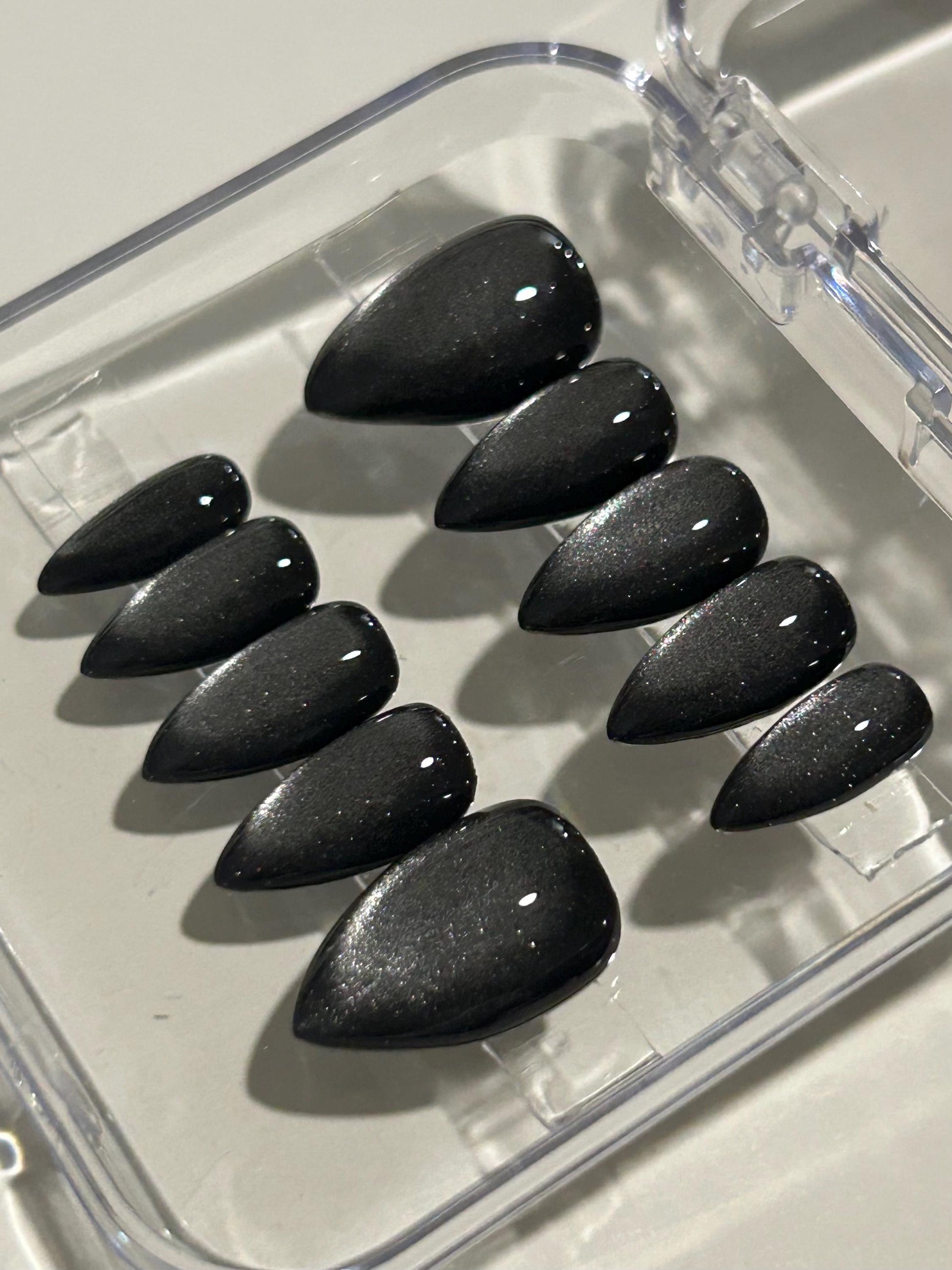 This set is crafted with meticulous care using high-quality UV gel materials, including Après Gel-X tips, Après Gel-X Prep surface primer, base gel, Function Of Vex Black Void color gel, Born Pretty cat eye gel, builder gel for added shine, structure, and reinforcement, and a topcoat to seal everything perfectly. With proper care, these luxury press-ons are reusable and built to last!