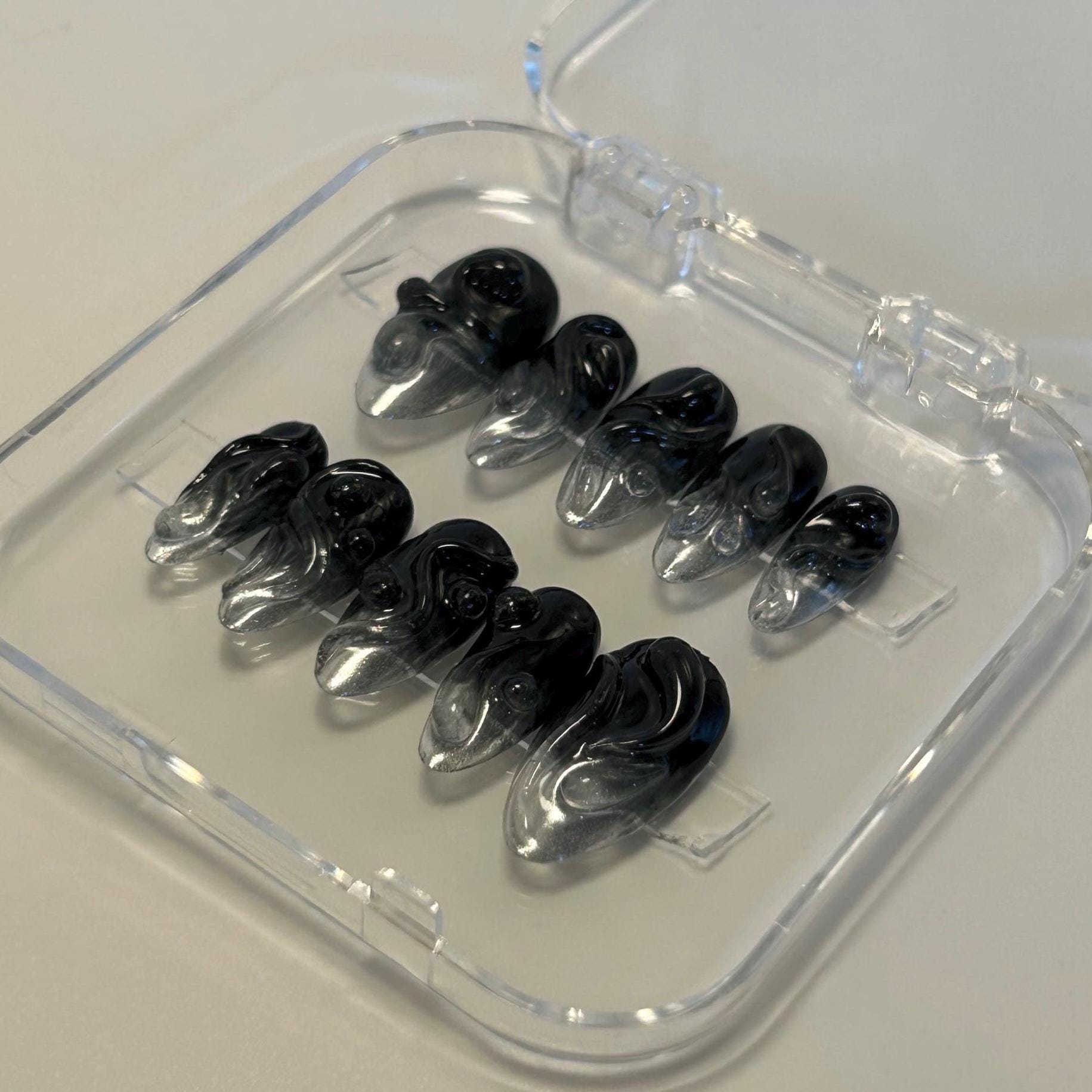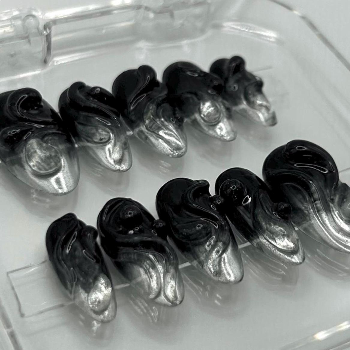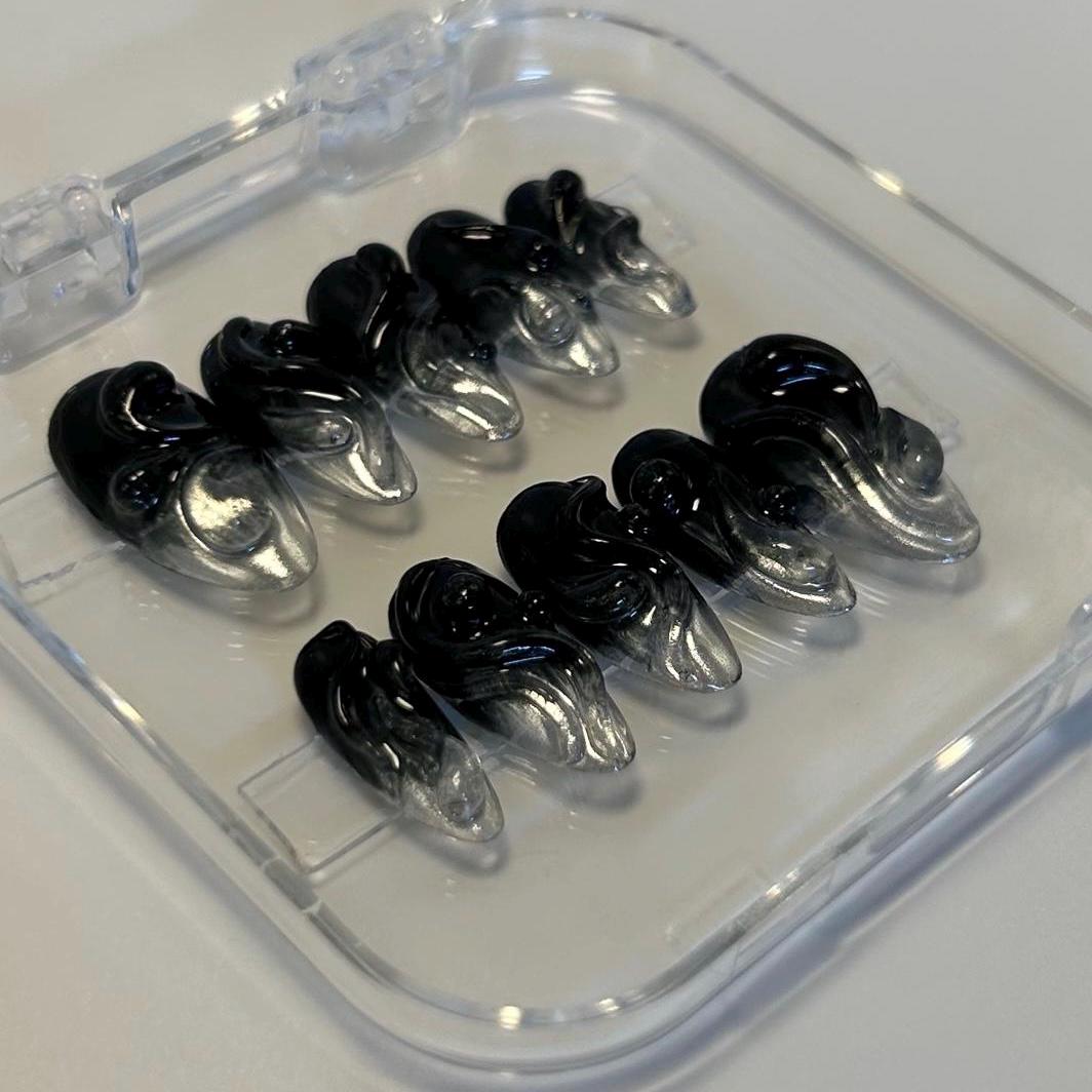 —MATERIALS AND CRAFTSMANSHIP— This set is crafted with meticulous care using high-quality materials, including Après Gel-X tips, Après Gel-X Prep surface primer, base gel, black color gel, Born Pretty silver mirror chrome powder, Makartt 3D Glux texture gel, builder gel for added shine, structure, and reinforcement, and a topcoat to seal everything perfectly. With proper care, these luxury press-ons are reusable and built to last!