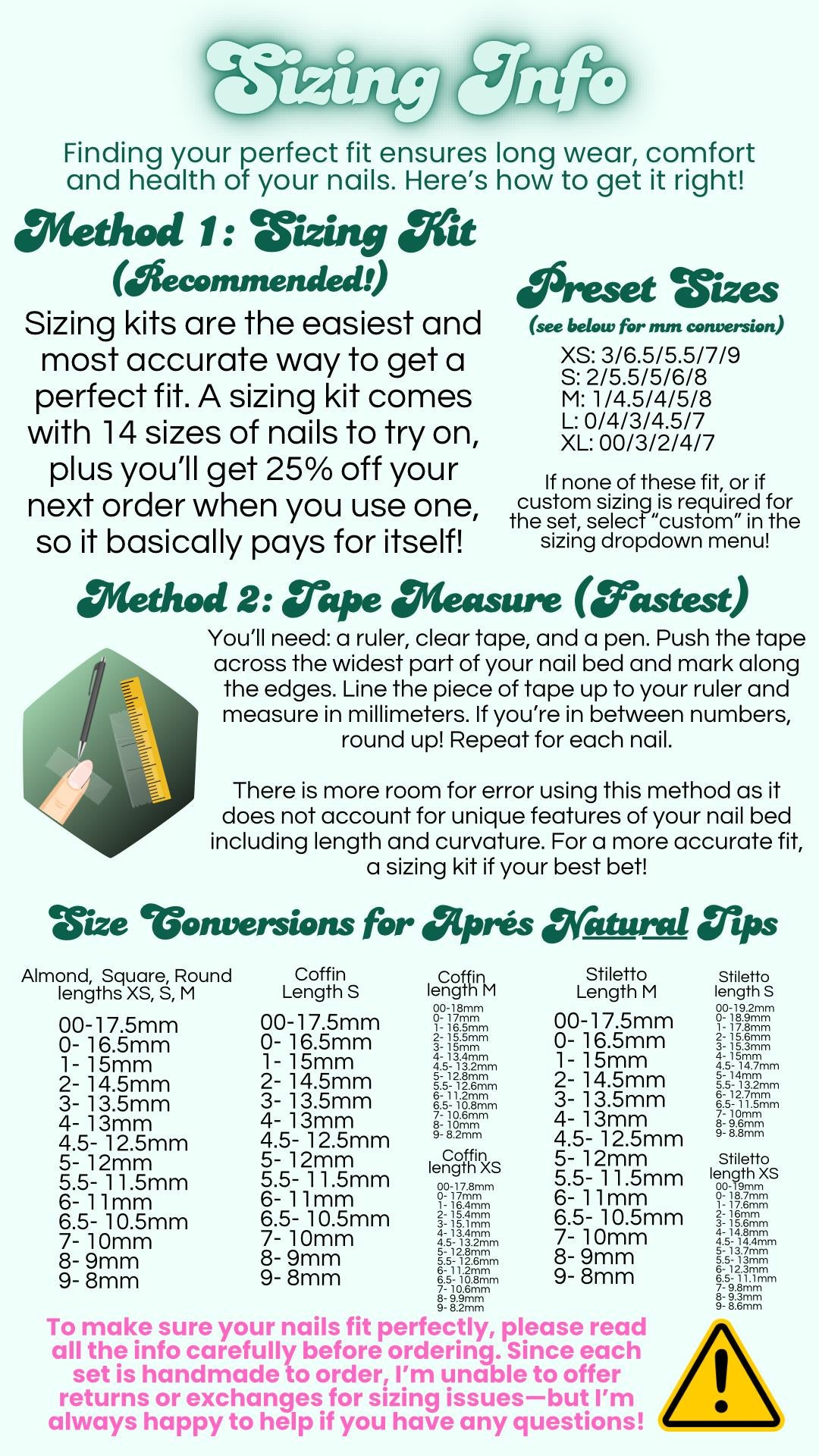 Need help finding your sizes? A sizing kit from my shop is the easiest and most accurate way to get a perfect fit—especially for shapes like Stiletto or Coffin, which can fit differently than other tip styles. Each Sizing Kit includes 14 sizes of nail tips to try on at home, plus a 25% off code for your next order—so it basically pays for itself!