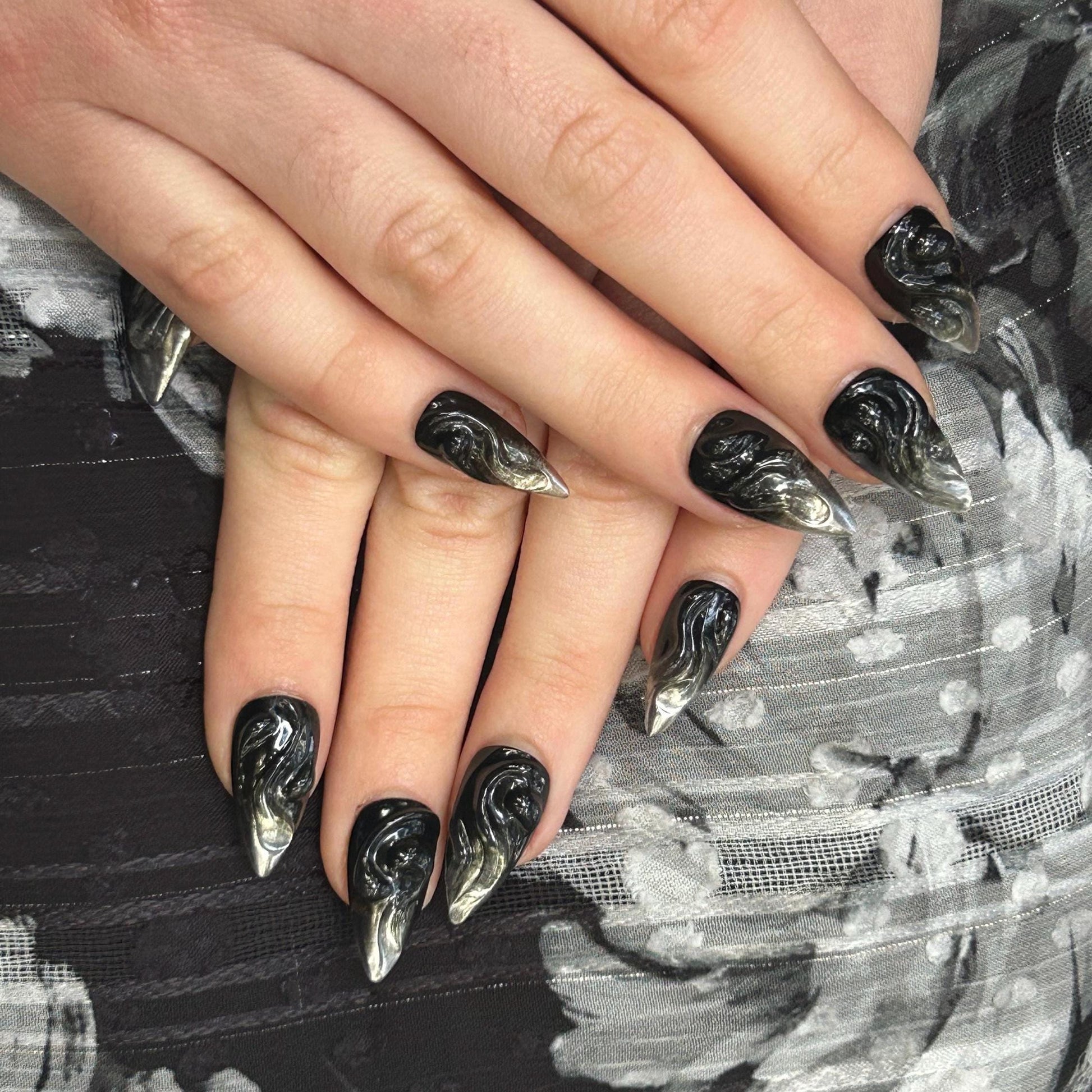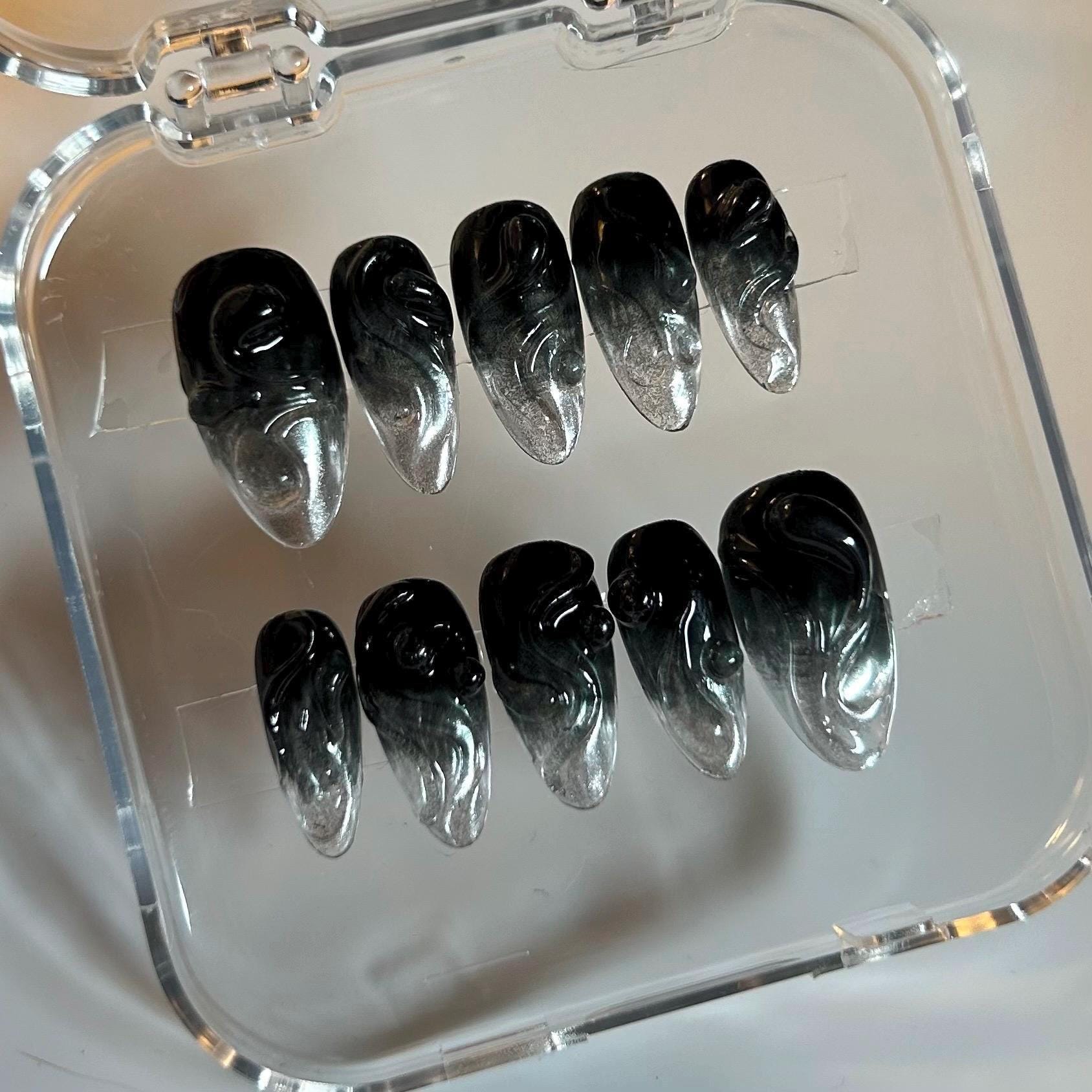 Pictured in Medium Almond and Short Stiletto. Embrace your dark side with these edgy Gel X black press-on nails, featuring silver mirror chrome ombre tips for a hauntingly beautiful look. The thick 3D texture gel adds an extra layer of dimension, making these nails perfect for those who love a goth, spooky, dark academia aesthetic. Please note: colors and shine will vary depending on photography, lighting and angles. Slight irregularities may occur due to the handmade nature of this set.