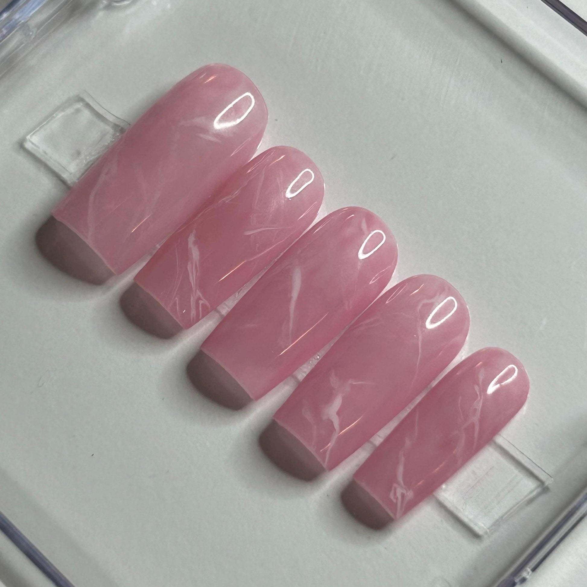 Handcrafted, high quality and reusable Apres Gel-X press-on nails inspired by Rose Quartz semi-precious stones. Soft pink nails with cloudy bursts and swirls, topped with a structured layer of builder gel for an acrylic look. To order this set in a custom color palette (such as jade or amethyst), send me a message here. Please note: colors and shine will vary depending on photography, lighting and angles. Slight irregularities may occur due to the handmade nature of this set.