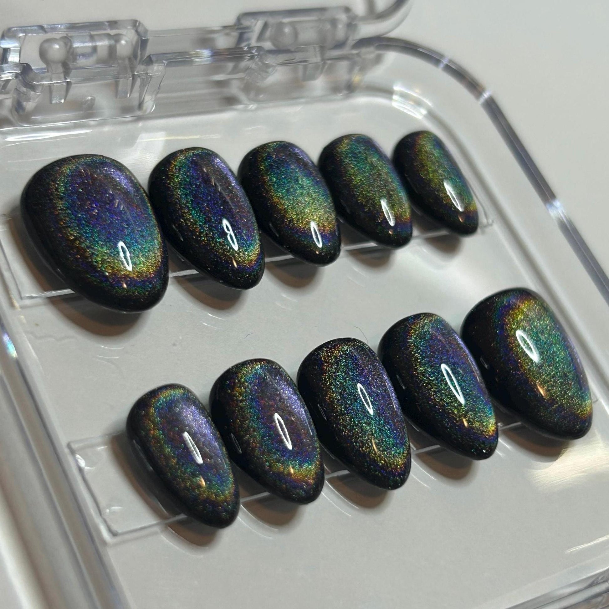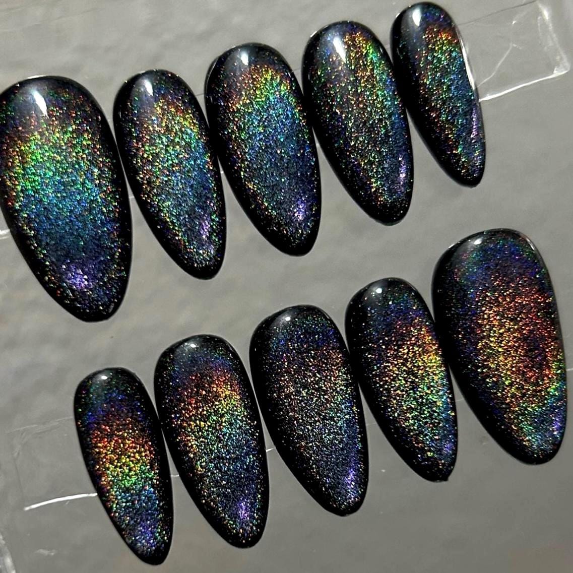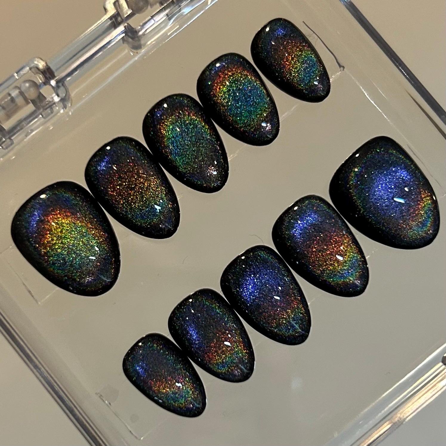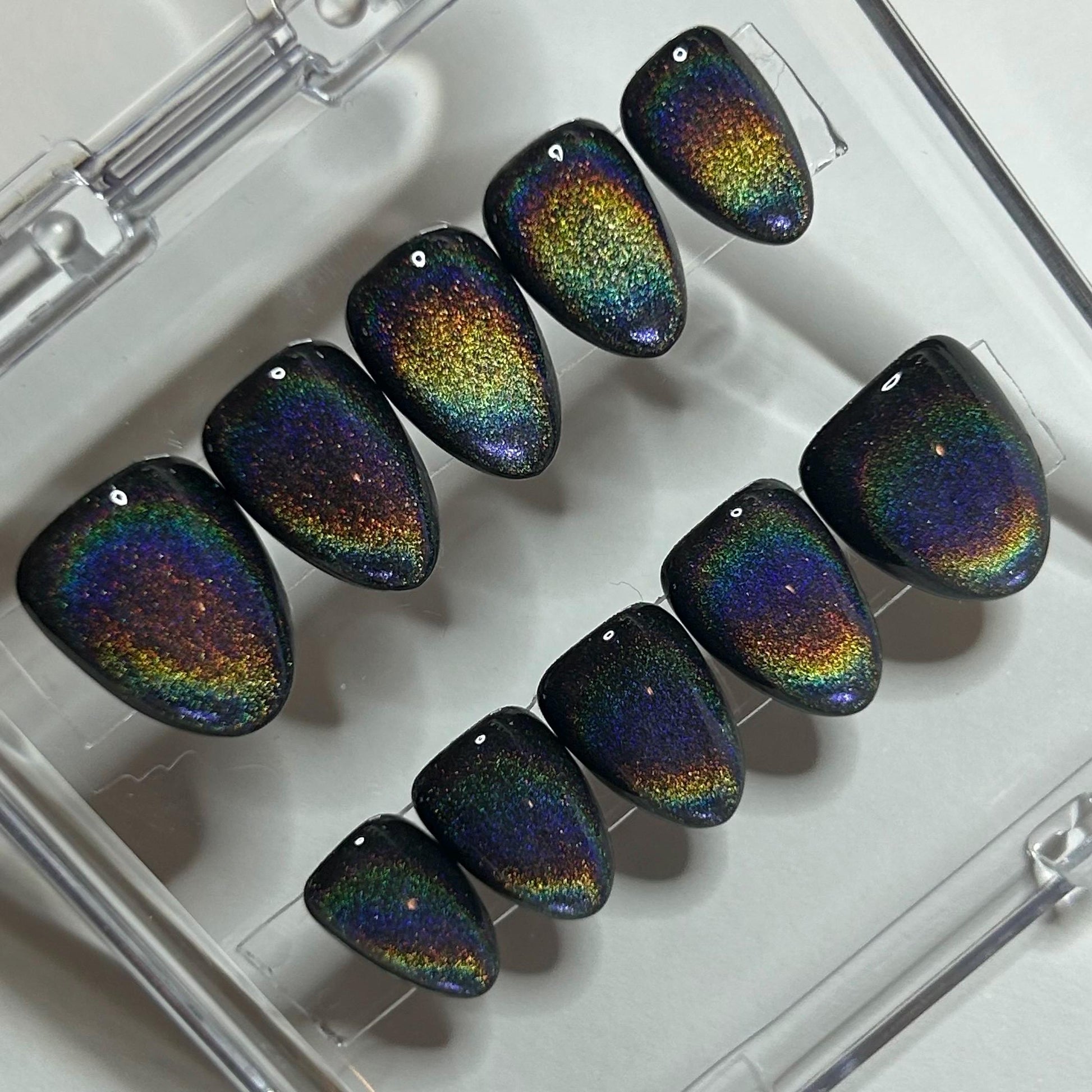 Pictured in Medium and Extra Short Almond. Glossy black nails with a rainbow cat eye shift magnetized into a radial ombre rainbow. The rainbow shimmer shifts colors in the light. Yes, it’s distracting, and no, you won’t be able to stop staring. Please note: colors and shine will vary depending on photography, lighting and angles. Slight irregularities may occur due to the handmade nature of this set.