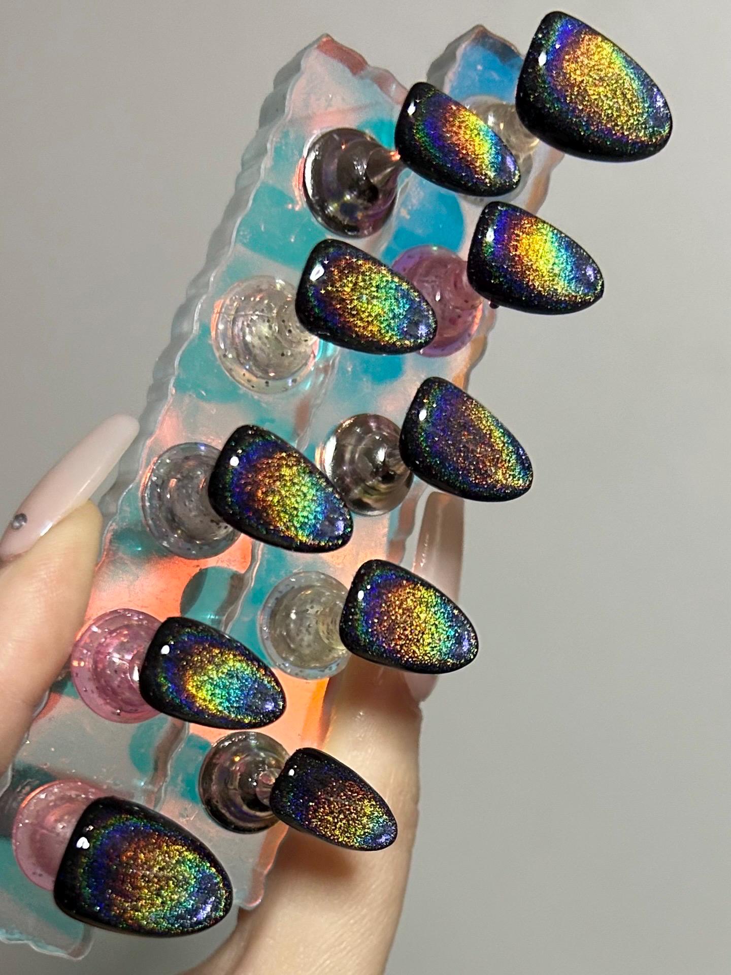 This set is crafted with meticulous care using high-quality UV gel materials, including Après Gel-X tips, Après Gel-X Prep surface primer, base gel, Function Of Vex Black Void color gel, Born Pretty rainbow cat eye gel, builder gel for added shine, structure, and reinforcement, and a topcoat to seal everything perfectly. With proper care, these luxury press-ons are reusable and built to last!