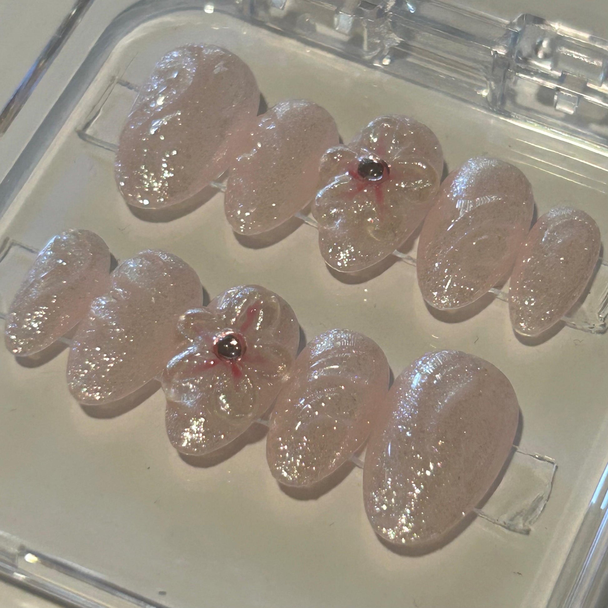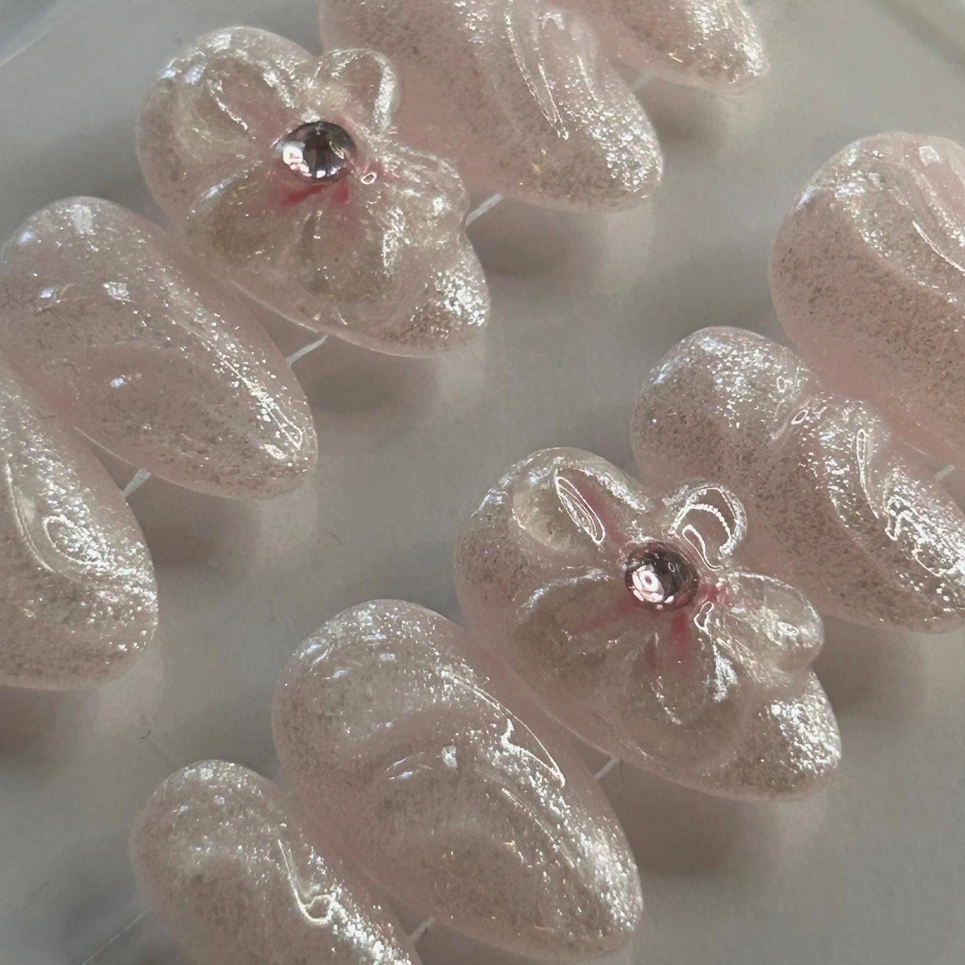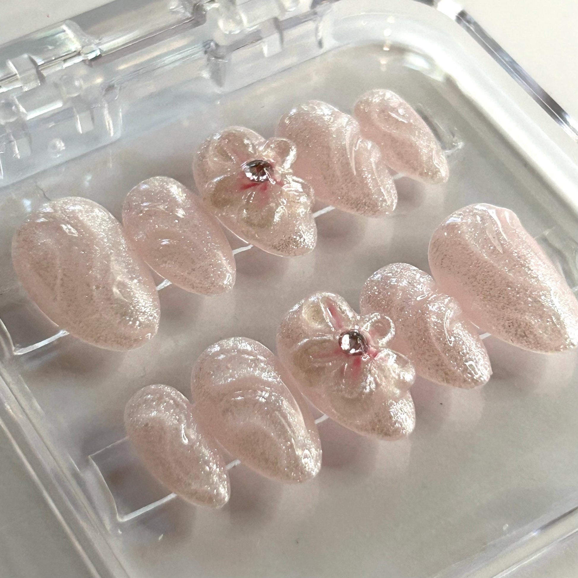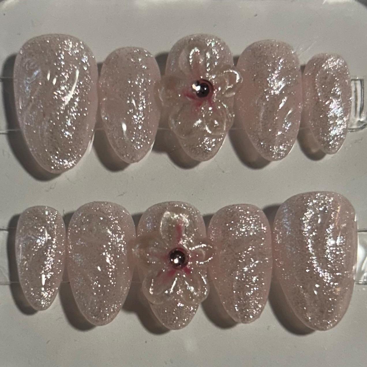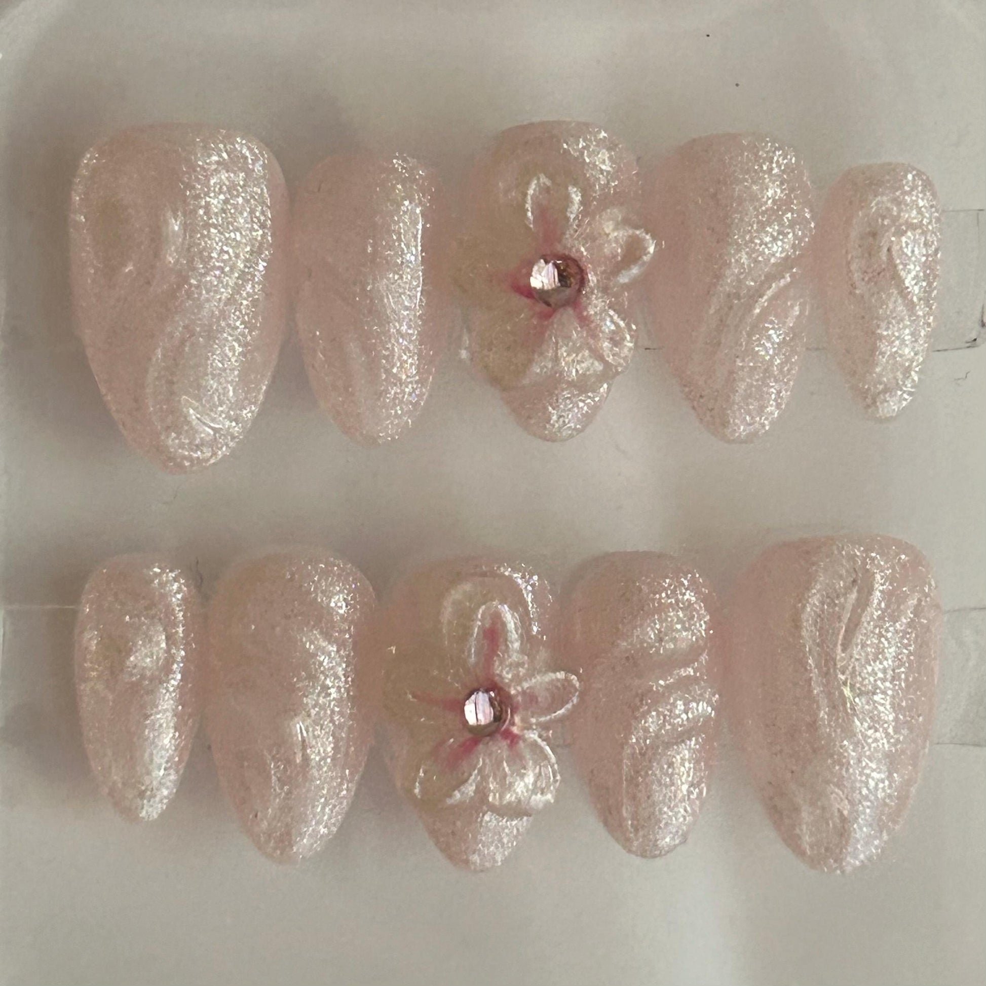 Pictured in Short Almond. Reusable soft nude baby pink press-on nails featuring a white flash glitter gel, 3d texture swirls and 3d cherry blossom flowers with pink detailing, pearl chrome detailing, and pink gems. These nails have a builder gel apex structure just like a fresh salon set, and builder gel chrome and rhinestone reinforcement. Please note: colors and shine will vary depending on photography, lighting and angles