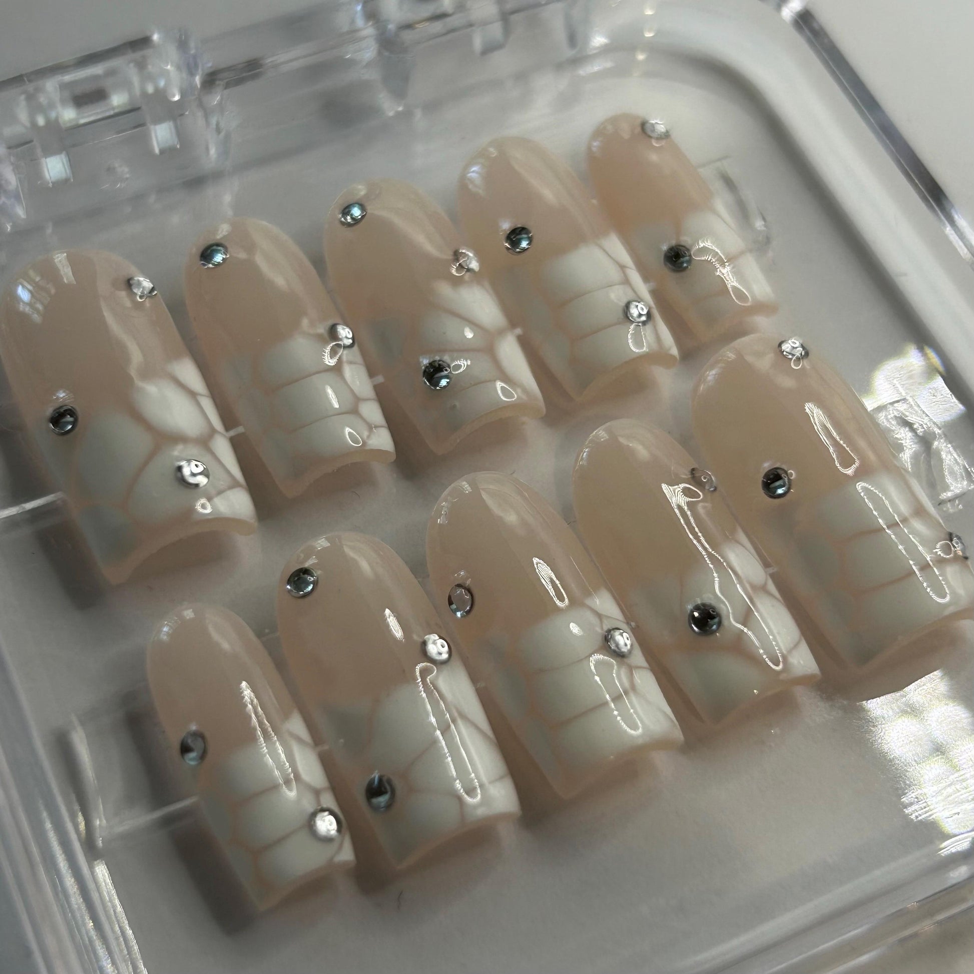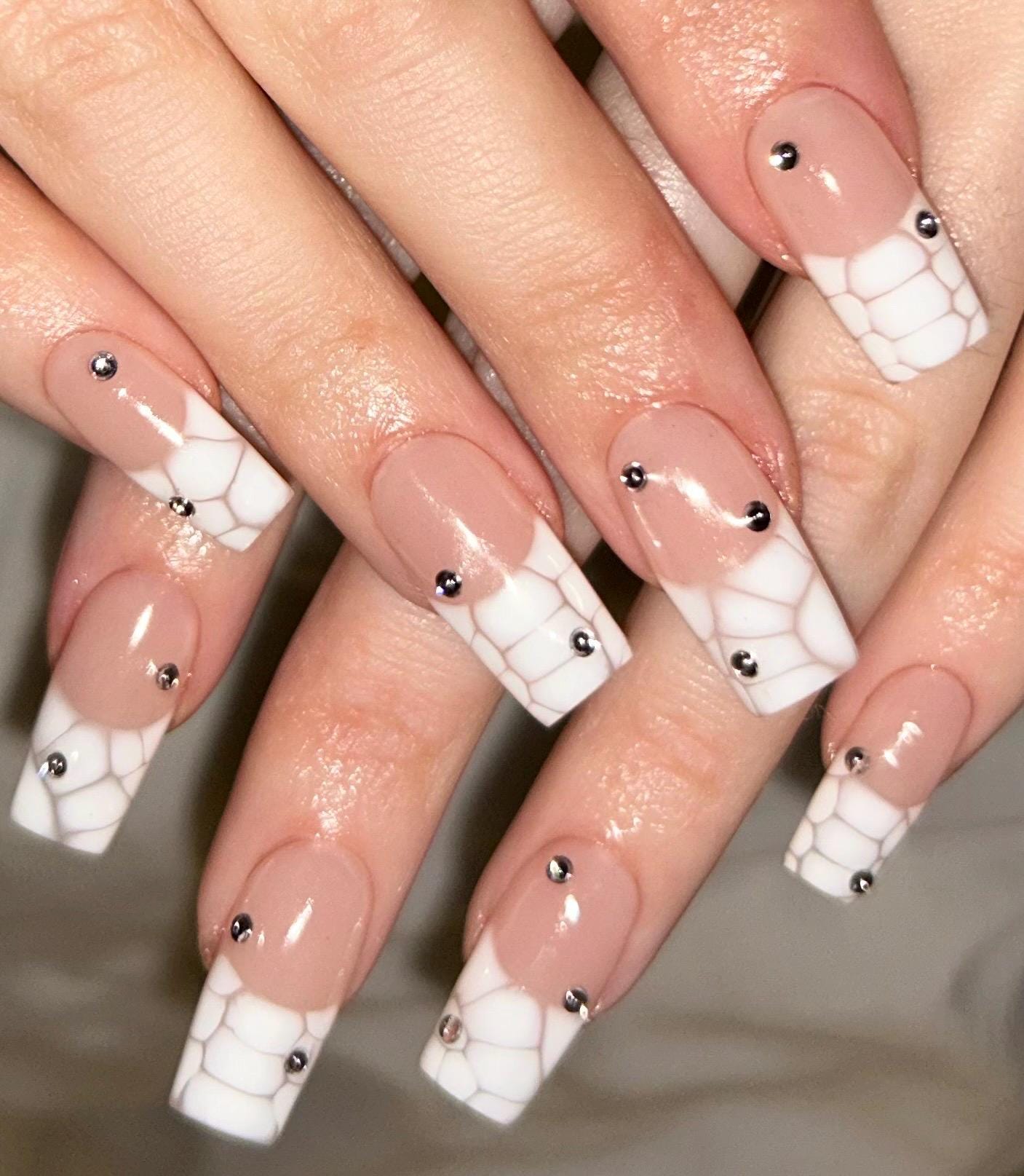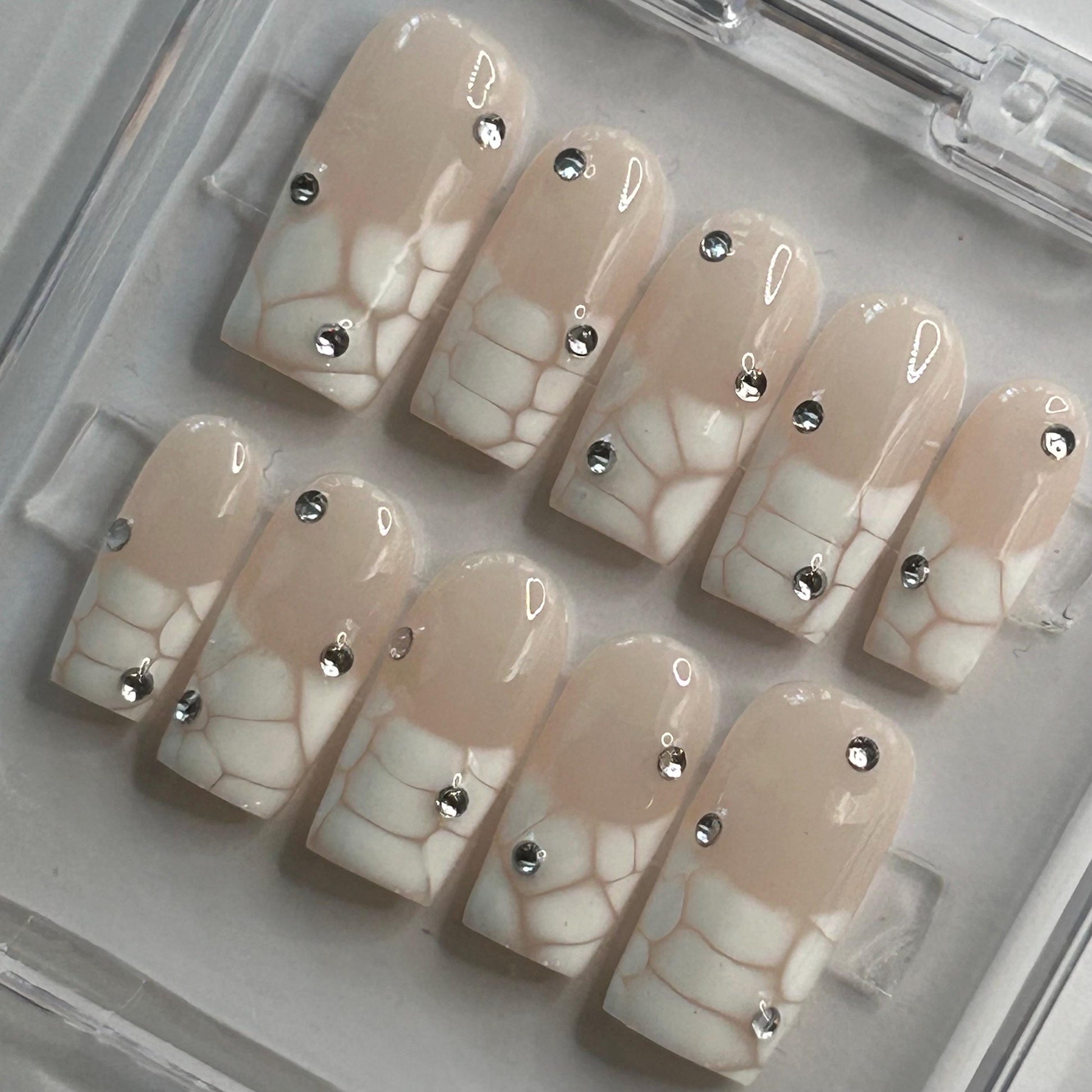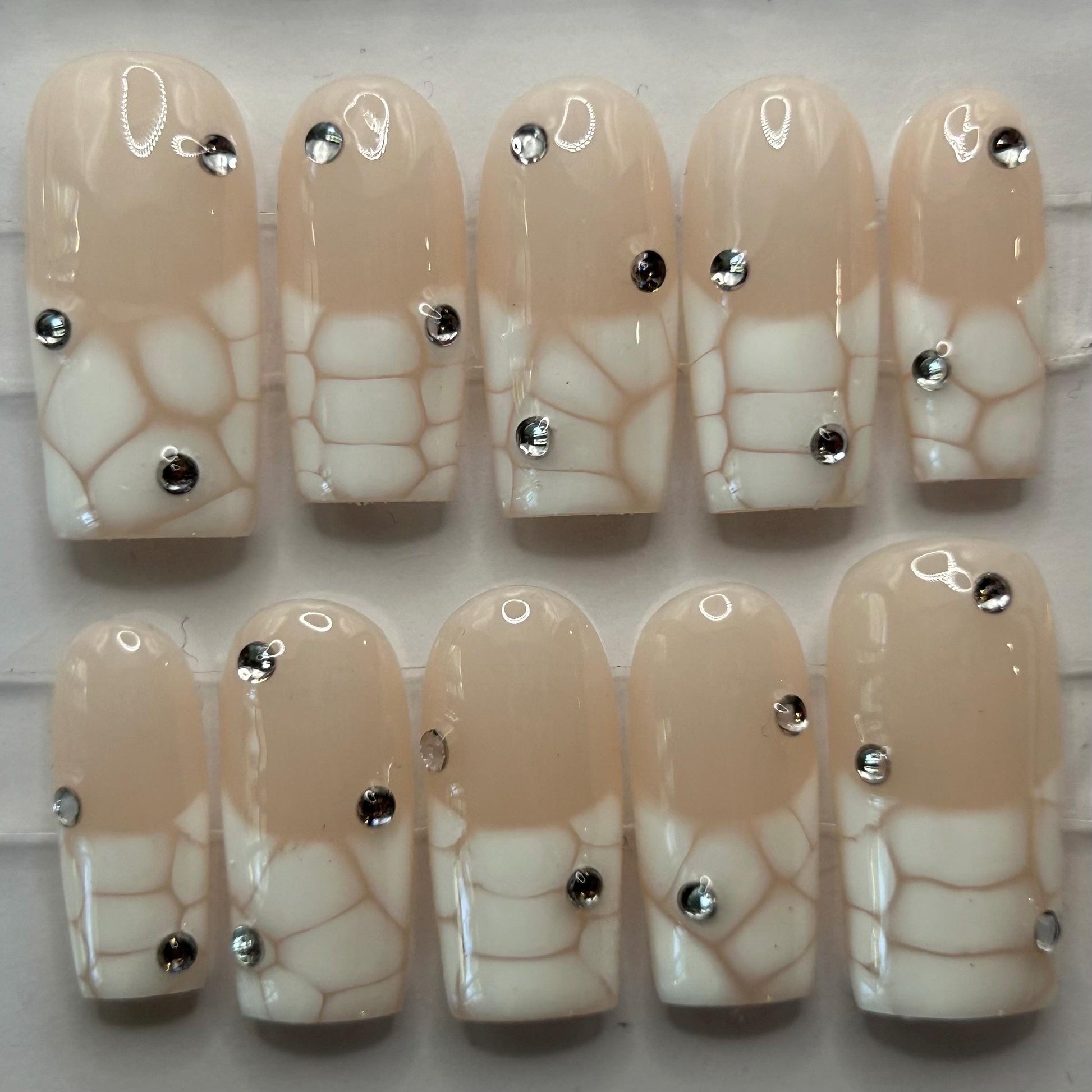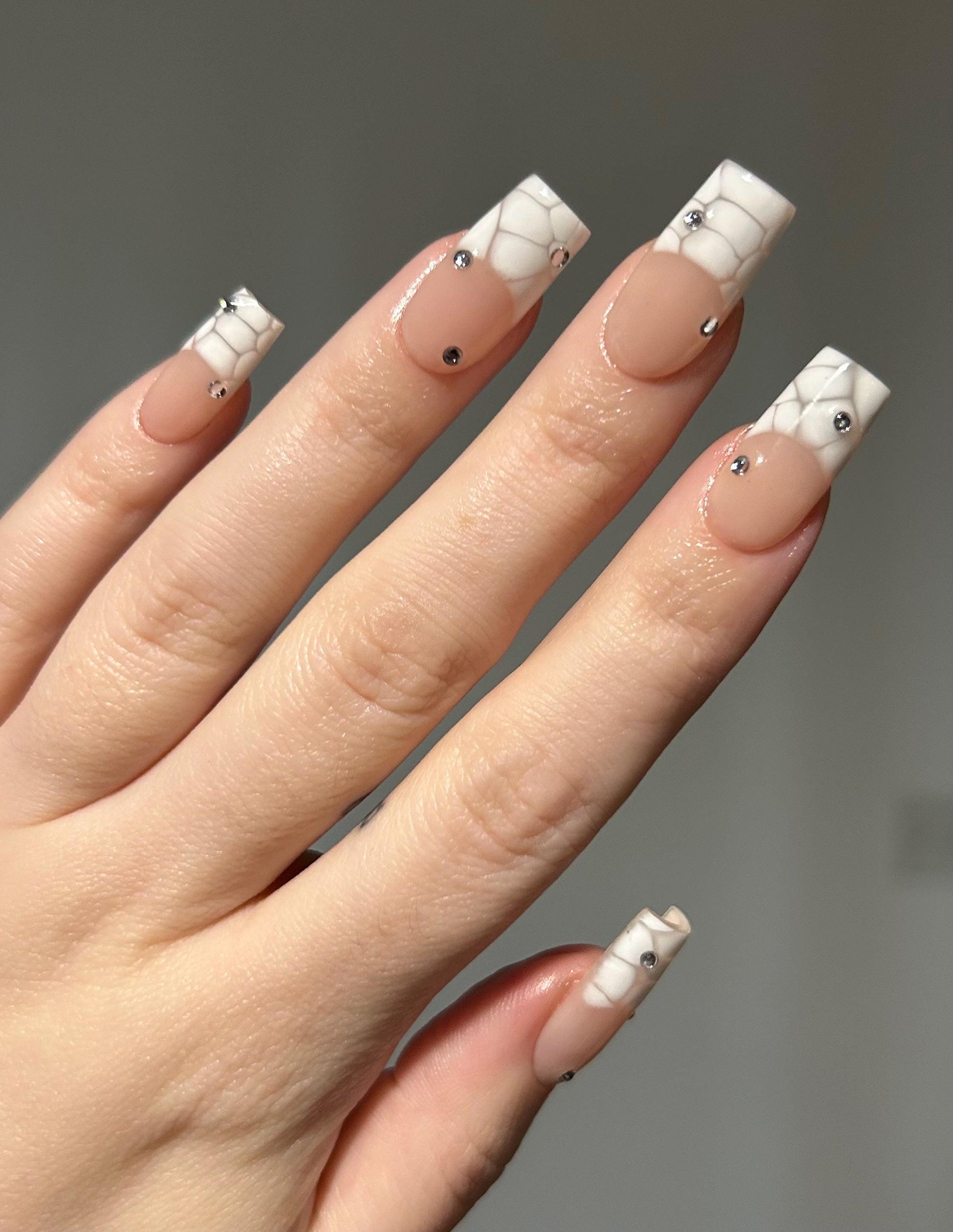 Pictured in Medium Square. Apres GelX press-on nails featuring a white crocodile snakeskin print on a thick y2k-cut French tip and silver rhinestone gems. The base and tip color are fully customizable, and the builder gel is added both after design and before design to provide leveling, an apex structure (like salon quality nails) and gem reinforcement. Extra Short orders will include a full croc/snakeskin print instead of a French tip due to the length. Please note: colors and shine will vary depending on photography, lighting and angles.