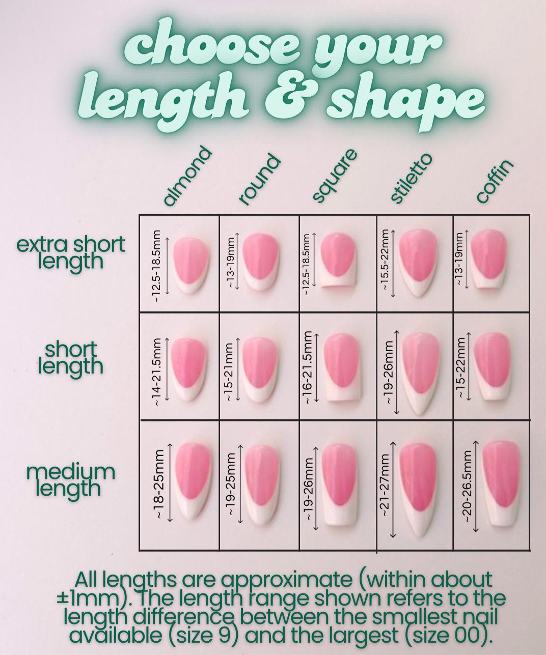 Lengths: Extra Short, Short and Medium **Please note that Extra Short is too short for the French tip design. If selected, the nails will feature the full nail in the snakeskin/croc print.**