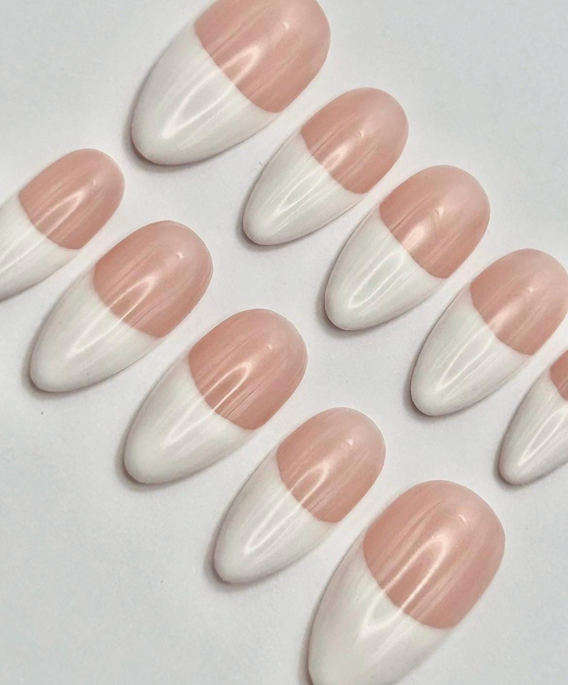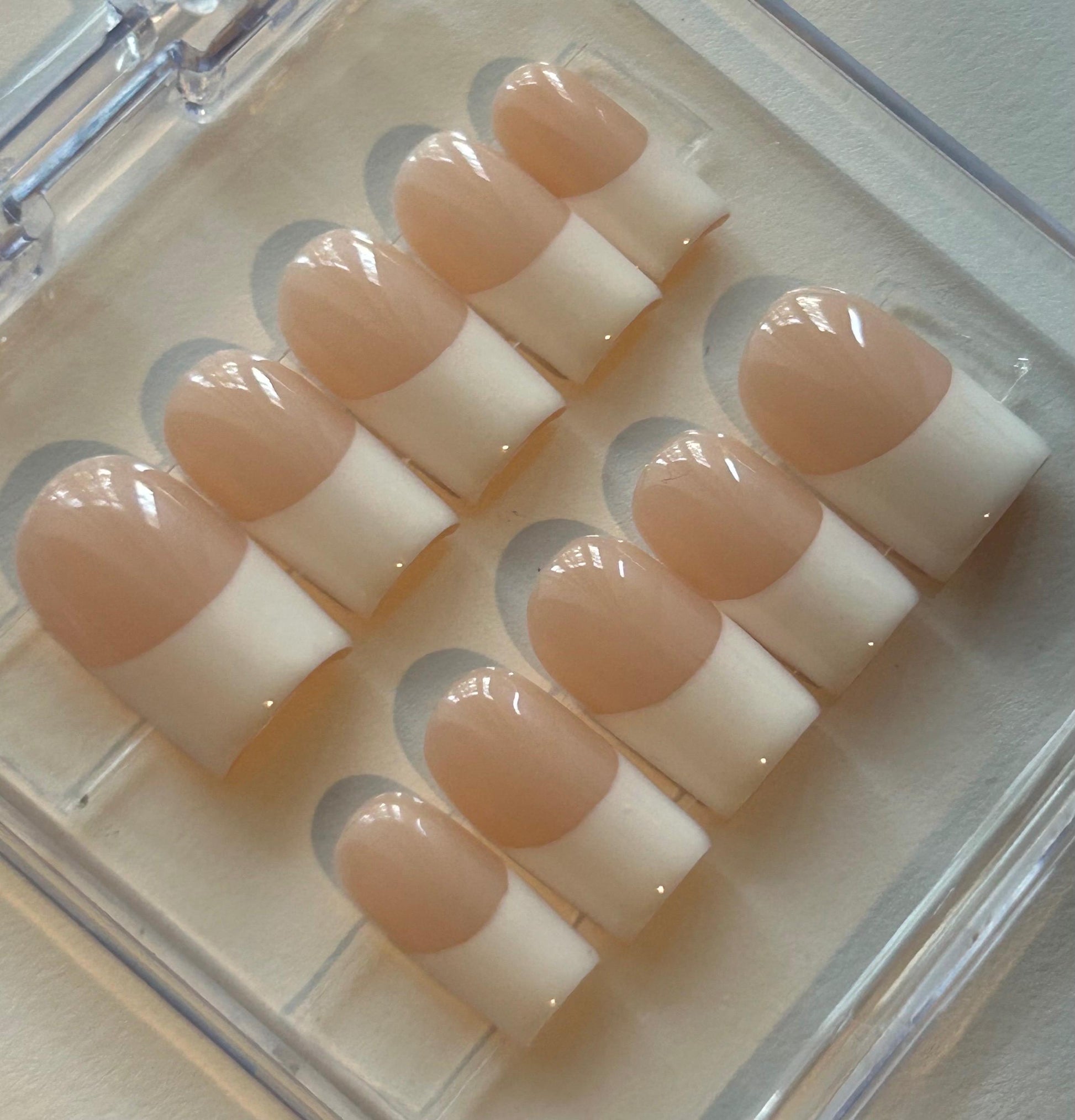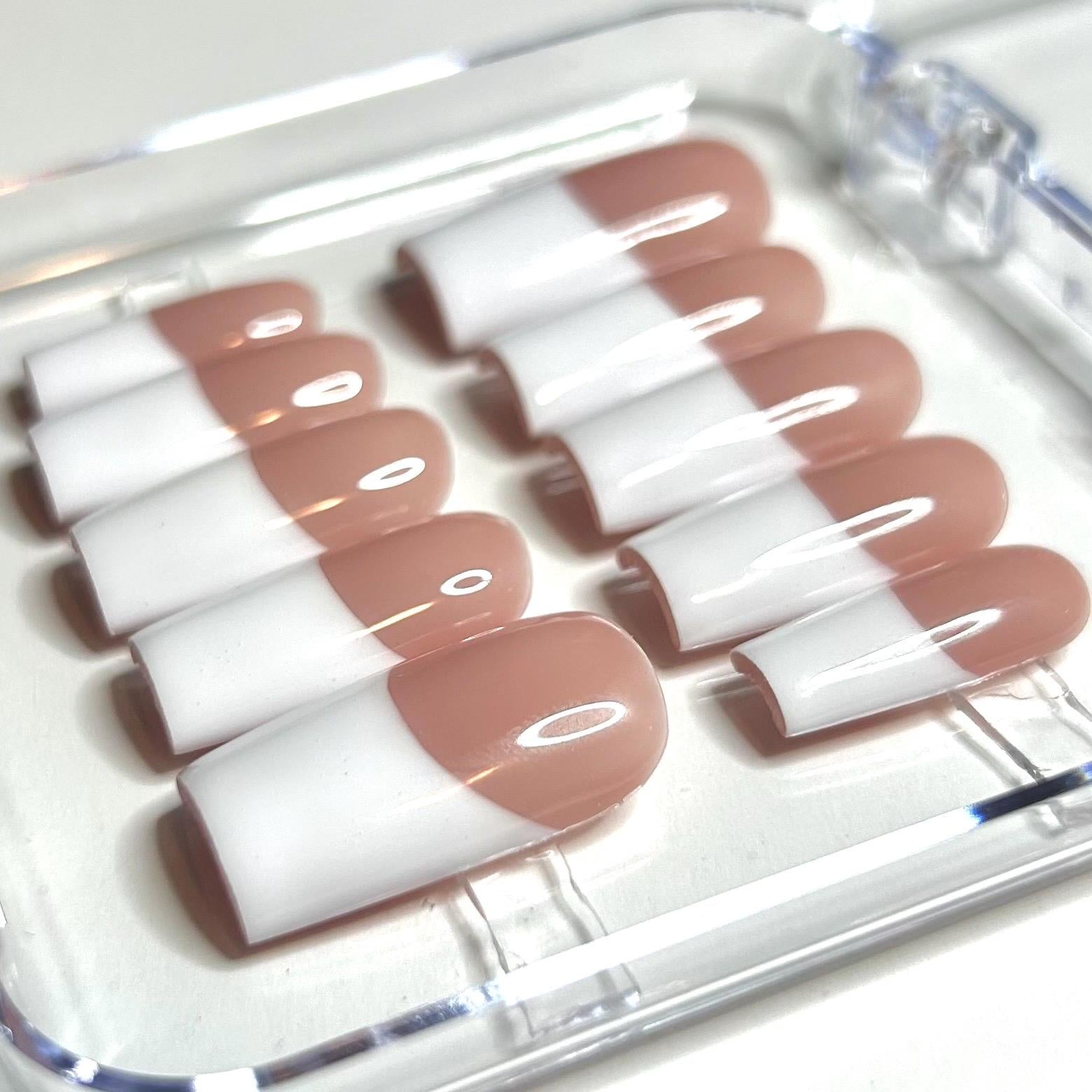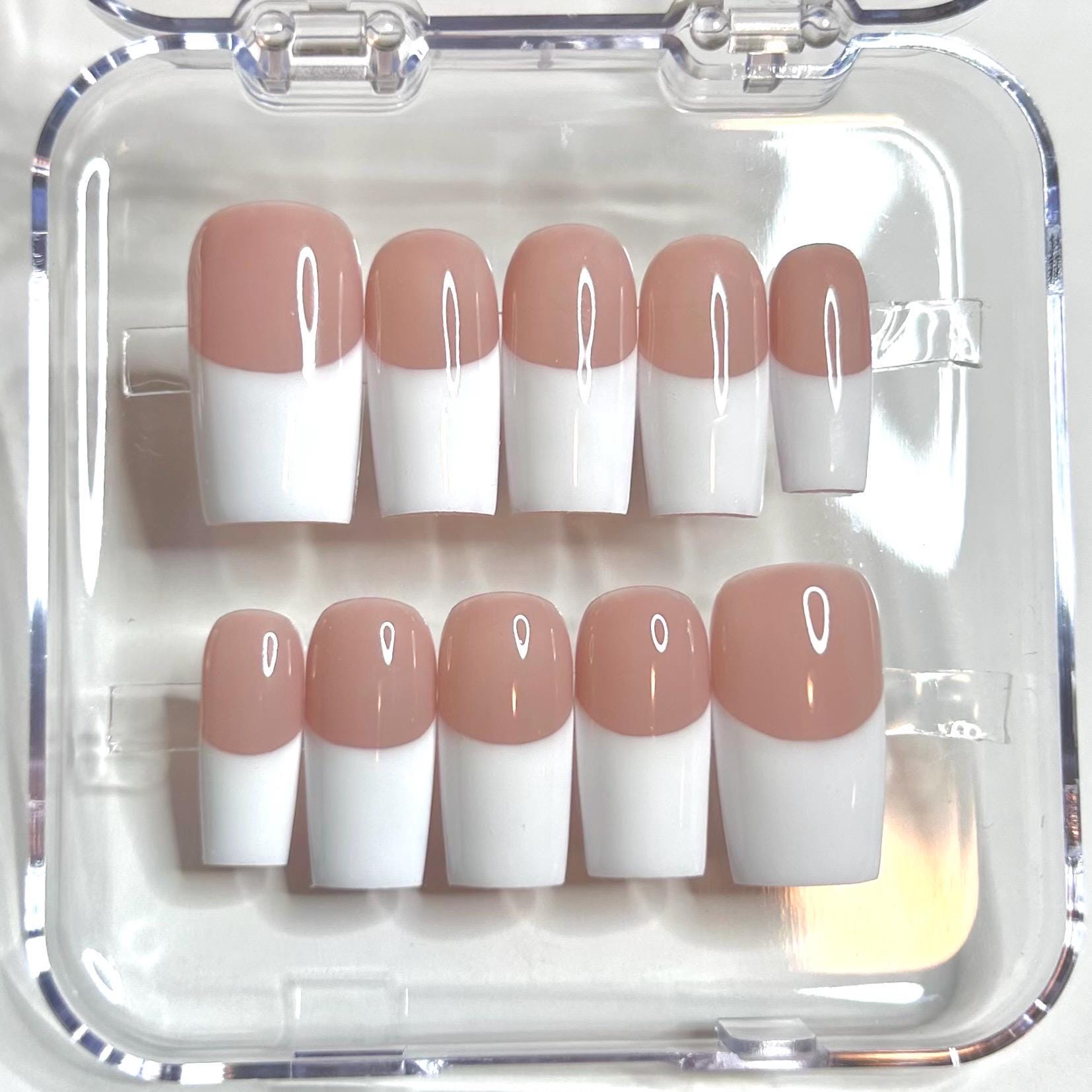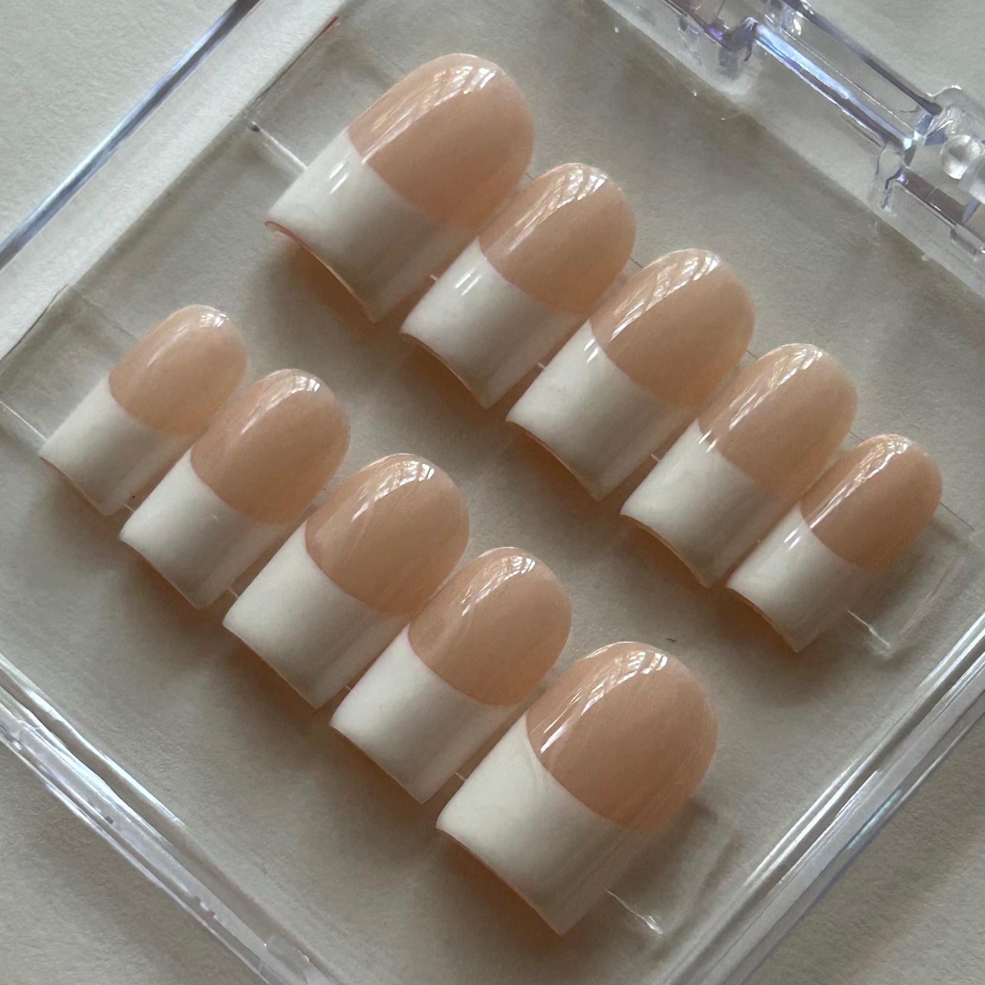 Set of 10 nails. Pictured in Medium Square, Short Square, Medium Almond Bold press-on nails with a thick-cut French manicure design, inspired by the classic style of Carmela Soprano. This set is crafted with a builder gel apex for optimal reusability and a structured shape you’d find on a set of salon-fresh acrylics. The base and tip colors are fully customizable, allowing you to personalize this timeless look to suit your style. Please note: colors and shine will vary depending on photography, lighting and angles. Slight irregularities may occur due to the handmade nature of this set.